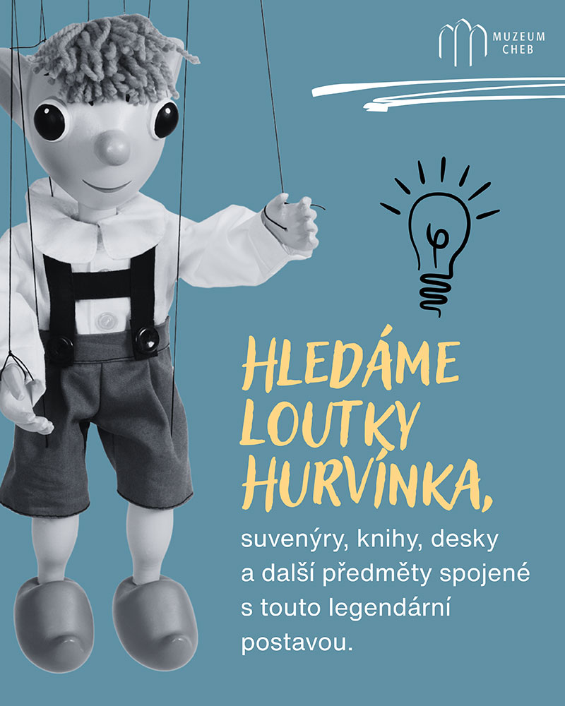 "V květnu letošního roku oslaví tento malý dřevěný rošťák stovku. Neuvěřitelné! A slavit se bude i v Chebu! Proč právě tady? Protože zde žil řezbář a loutkář Gustav Nosek (1887–1974), stvořitel Hurvínka. Při této příležitosti připravujeme jubilejní výstavu a další doprovodný program pro malé i velké návštěvníky. Zapátrejte v komorách, ve sklepích a na půdách a pomozte nám objevit rodinné poklady – vše, co se váže k Hurvínkovi – loutky, figurky, plakáty, knihy, gramodesky, hračky, suvenýry a další předměty s “hurvínkovskou” tematikou. Vaše nálezy se mohou stát součástí muzejních sbírek – darem, nebo i koupí. Největší poklady se mohou stát i součástí výstavy!