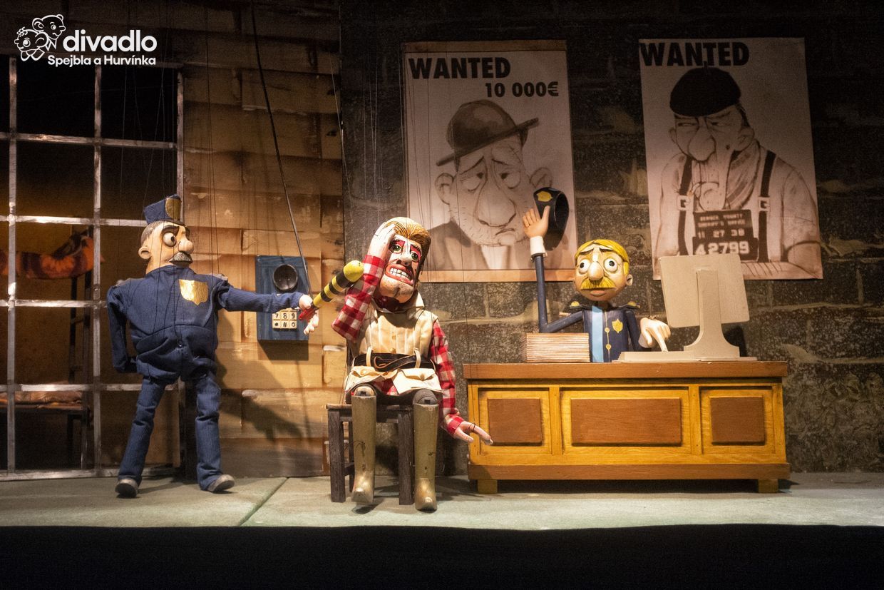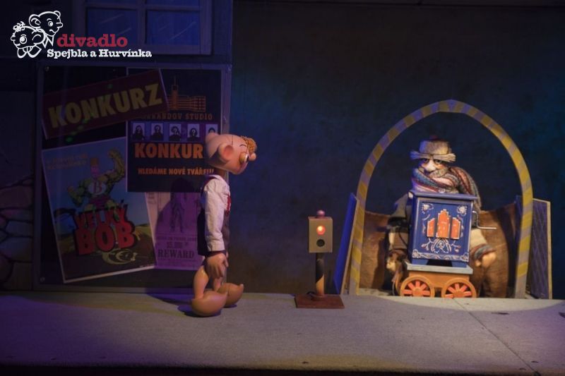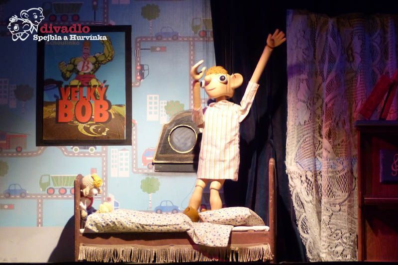 V Hurvínkově přání oceňuji důslednou a kvalitní výstavbu děje i tématu v první polovině hry. Hurvínek nechce uklízet, chce jít do kina na nepřístupný film, a ne na Pinokia, touží už být velký. Peníze, za které ho nepustili do kina, chce dát na přilepšenou flašinetáři (má dobré srdce), ten se promění v pohádkového dědečka a splní mu jeho největší přání – učiní jej dospělým. Přesněji dítětem v dospělém těle, což se postupně stane zdrojem mnoha groteskních eskapád, ale také příčinou neustále se stupňujícího smutku hlavního hrdiny, který v kůži dospěláka není tak šťastný, jak očekával. Na slovní žerty při vyprodané repríze reagovali daleko více dospělí než děti. Ty šly naopak zaujatě s příběhem. Starší děti pak odhalily dramaturgické slabiny inscenace, když komentovaly zdlouhavé výstupy kamelotů/novinářů slovy: Ty dva jsou tam jenom proto, aby to změnili. A je to pravda, "forbíny" jen vysvětlují děj, nebo ho předjímají, čímž jsou nadbytečné. Příběh nerytmizují, na to jsou moc dlouhé a prosty nových jevištních nápadů. Jediným jejich údělem je vyplňovat retardačními dialogy nezbytnou přestavbu. Pozornost ovšem poutají změnou technologie loutky (muppeti), celkově současnějším vizuálem a modernější, dynamickou hudbou, která se s nimi pojí. Děti v hledišti k mému překvapení samy řešily, jestli je zvuk nahraný, nebo interpretovaný živě. Tipovaly, že nahraný. Scénografie M. Kirschnera je plná rozporů, když současný styl (tapety a plakáty v pokoji) míchá s retrem (rádio, telefon, postel s třásněmi, Hurvínkova noční košilka, záclona s ornamenty, to vše v prvorepublikovém duchu). Rozpornost přitom nemá dramatický význam. Motiv pohádkového dědečka s flašinetem fungoval dobře, škoda jen vlasce od nákladního výtahu, který rušil scénu (druhý plán s příjezdem hvězdy). Výtvarnou nejednotnost ospravedlňují dílčí loutkářské nápady – zejména Hurvínkův ranní růst nebo Hurvínkův skvělý brejk. Ovšem chtělo by to mnohem víc takových živých prvků. Druhá půlka se nese v duchu klopotné snahy rychle dovyprávět příběh. Dědeček nemá flašinet a Máničce splní přání nikoli za dobrý skutek, ale aby ho přestala otravovat neustálým přivoláváním nákladního výtahu. Policisté volají na Hurvínkovo přání ke Spejblům, ale neodhalí přitom ani, že jde v osobě Spejbla o otce pohřešovaného Hurvínka. O realizaci telefonátu požádal policisty zatčený, v dospělce proměněný Hurvínek, ale následně nijak neřeší ani nekomentuje, že a jak policajti situaci s telefonem zpackali… Zkrátka, textu schází důslednější dramaturgické vedení.