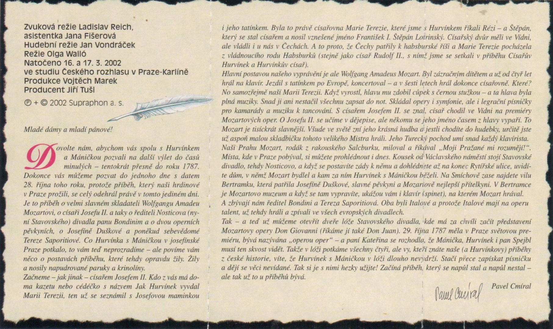 dovolte nám, abychom vás spolu s Hurvínkem a Máničkou pozvali na další výlet do časů minulých - tentokrát přesně do roku 1787. Dokonce vás můžemě pozvat do jednoho dne s datem 28. října toho roku, protože příběh, který naši hrdinové v Praze prožili, se celý odehrál právě v tomto jediném dni. Je to příběh o velmi slavném skladateli Wolfgangu Amadeu Mozartovi, o císaři Josefu II. a taky o řediteli Nosticova (nyní Stavovského) divadla panu Bondinim a o dvou operních pěvkyních, o Josefíně Duškové a poněkud sebevědomé Tereze Saporitiové. Co Hurvínka s Máničkou v josefínské Praze potkalo, to vám teď neprozradíme - ale povíme vám něco o postavách příběhu, které tehdy opravdu žily. Žily a nosily napudrované paruky a krinolíny.
