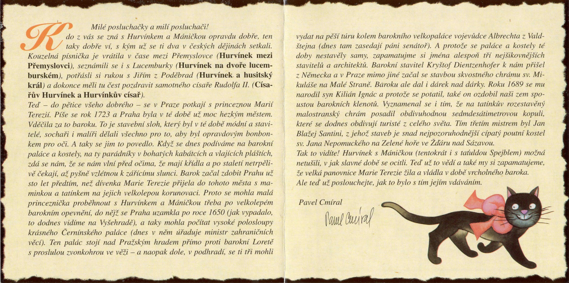 Teď - do pětice všeho dobrého - se v Praze potkají s princeznou Marií Terezií. Píše se rok 1723 a Praha byla v té době už moc hezkým městem. Vděčila za to baroku. To je stavební sloh, který byl v té době módní a stavitele, sochaři i malíři dělali všechno pro to, aby byl opravdovým bonbónkem pro oči. A taky se jim to povedlo. Když se dnes podíváme na barokní paláce a kostely, na ty parádníky v bohatých kabátcích a vlajících pláštích, zdá se nám, ze se nám vlní před očima, že mají křídla a po staletí netrpělivě čekají, až pyšně vzlétnou k zářícímu slunci. Barok začal zdobit Prahu už sto let předtím, než dívenka Marie Terezie přijela do tohoto města s maminkou a tatínkem na jejich velkolepou korunovaci. Proto se mohla malá princeznička proběhnout s Hurvínkem a Máničkou třeba po velkolepém barokním opevnění, do nějž se Praha uzamkla po roce 1650 (jak vypadalo, to dodnes vidíme na Vyšehradě), a taky mohla počítat vysoké polosloupy krásného Černínského paláce (dnes v něm úřaduje ministr zahraničních věcí). Ten palác stojí nad Pražským hradem přímo proti barokní Loretě s proslulou zvonkohrou ve věži - a naopak dole, v podhradí, se ti tři mohli vydat na pěší túru kolem, barokního velkopaláce vojevůdce Albrechta z Valdštejna (dnes tam zasedají páni senátoři). A protože se paláce a kostely té doby nestavěly samy, zapamatujme si jména alespoň tří nejšikovnějších stavitelů a architektů. Barokní stavitel Kryštof Dientzenhofer k nám přišel z Německa a v Praze mimo jiné začal se stavbou skvostného chrámu sv. Mikuláše na Malé Straně. Baroku ale dal i dárek nad dárky. Roku 1689 se mu narodil syn Kilián Ignác a protože se potatil, také on ozdobil naši zem spoustou barokních klenotů. Vyznamenal se i tím, že na tatínkův rozestavěný malostranský chrám posadil obdivuhodnou sedmdesátimetrovou kopuli, které se dodnes obdivují turisté z celého světa. Tím třetím mistrem byl Jan Blažej Santini, z jehož staveb je snad nejpozoruhodnější cípatý poutní kostel sv. Jana Nepomuckého na Zelené hoře ve Žďáru nad Sázavou.