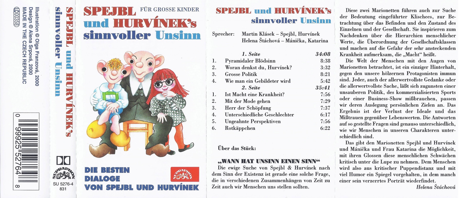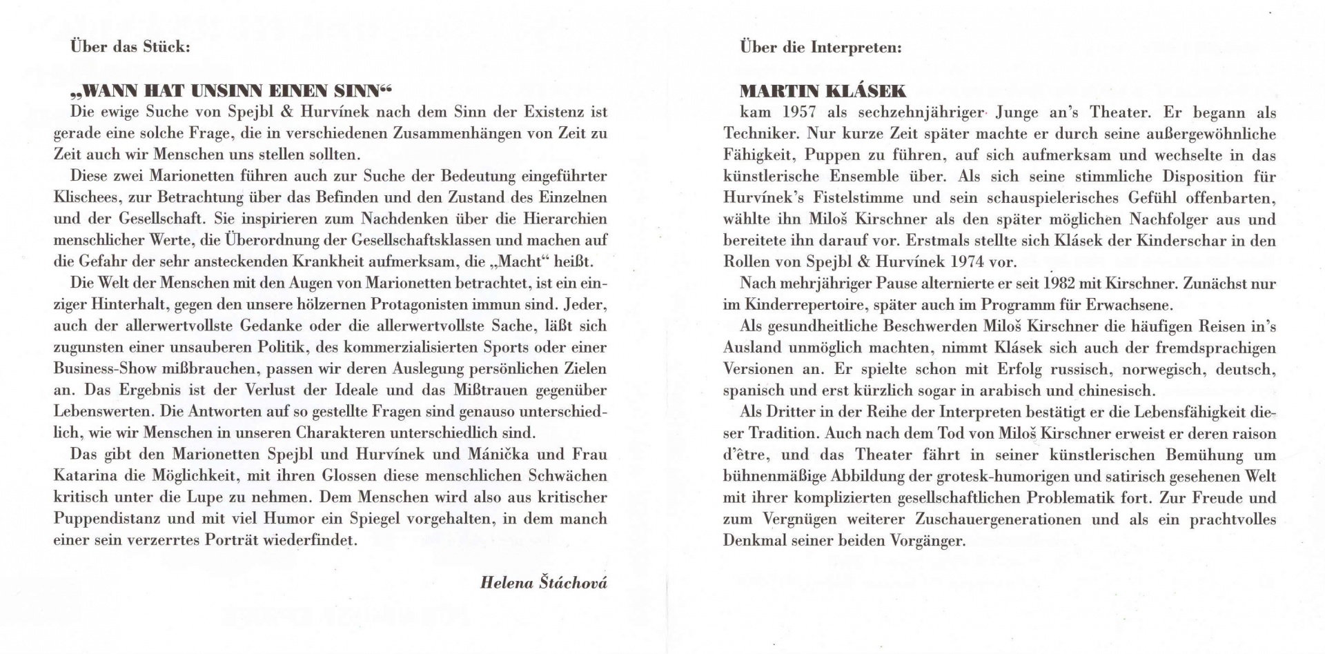 29. února 1996 měla v Divadle S+H premiéru filozofická hra Heleny Štáchové Spejblovy smysluplné nesmysly. Pro Miloše Kirschnera se bohužel při této premiéře jednalo o poslední vystoupení v rolích Spejbla a Hurvínka. O čtyři roky později vychází titul s Martinem Kláskem coby S+H u vydavatelství Supraphon a to pouze v německém překladu Christiny Moravcové pod názvem Spejbl und Hurvínek sinnvoller Unsinn. V češtině jsou ze hry k dispozici jen dva kratší dialogy.