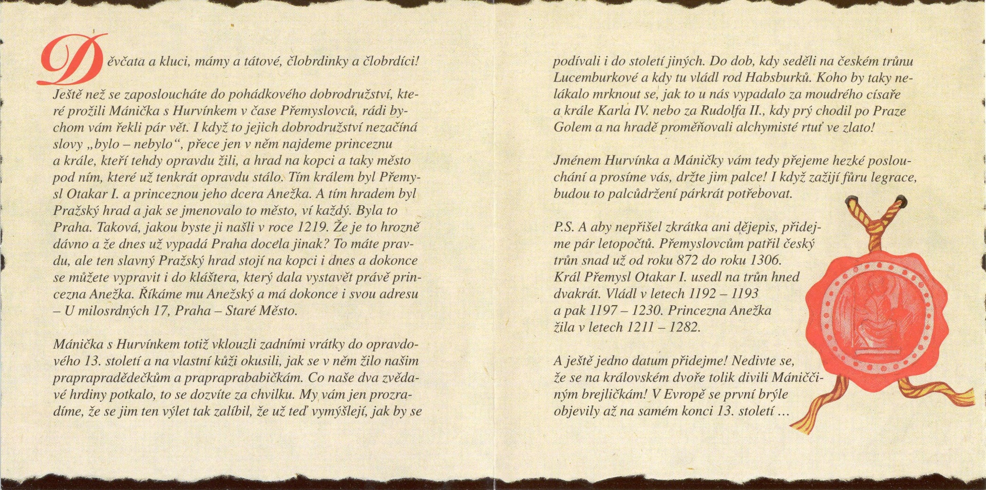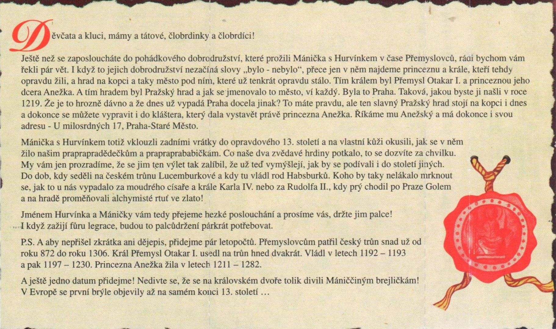 Ještě než se zaposloucháte do pohádkového dobrodružství, které prožili Mánička s Hurvínkem v čase Přemyslovců, rádi bychom vám řekli pár vět. I když to jejich dobrodružství nezačíná slovy "bylo - nebylo", přece jen v něm najdeme princeznu a krále, kteří tehdy opravdu žili, a hrad na kopci a taky město pod ním, které už tenkrát opravdu stálo. Tím králem byl Přemysl Otakar I. a princeznou jeho dcera Anežka. A tím hradem byl Pražský hrad a jak se jmenovalo to město, ví každý. Byla to Praha. Taková, jakou byste ji našli v roce 1219. Že je to hrozně dávno a že dnes už vypadá Praha docela jinak? To máte pravdu, ale ten slavný Pražský hrad stojí na kopci i dnes a dokonce se můžete vypravit i do kláštera, který dala vystavět právě princezna Anežka. Říkáme mu Anežský a má dokonce i svou adresu - U milosrdných 17, Praha - Staré Město.