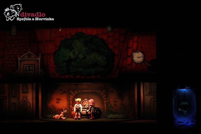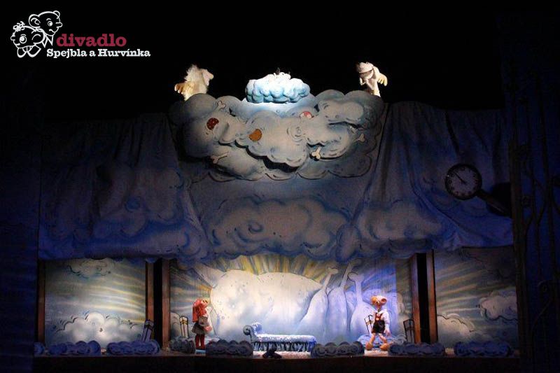 Inscenace Hurvínkova Nebesíčka nabízí emocionálně působivou divadelní studii vztahu mezi Hurvínkem a Žerykem potažmo dítětem a jeho psem. Hurvínek, Mánička a jejich čtyřnohý kamarád se během ní ocitnou v podivuhodném domě zvaném Nebesíčka, který se tu a tam zjevuje na Malé Straně! V domě se nachází podivná skříň Kostitřaska, pomocí které se lze za určitých okolností nechat torpédovat na onen svět. Příběh začíná ve chvíli, kdy se Hurvínek rozhodne vyzrát na domácí úkol o řeči zvířat tím, že naučí Žeryka mluvit lidskou řečí. Když to Žeryčkovi nejde, vztekle se ho zřekne. Načež Žeryk uteče a my se posléze dozvíme, že to zabalil a odebral se na Nebesíčka. A že vrátit ho zpět na zem nebude snadné. Zodpovědnost Hurvínka za křivdu, které se dopustil na nevinném psu, je pak hlavním a vcelku dobře rozehraným motivem i tématem hry. Jazyk inscenace je zatěžkán vysokým procentem anachronismů a knižních výrazů typu „velebný kmet“, „koule-bajle“, které kdysi sice patřívaly do Hurvínkova slovníku, ovšem nejsou součástí aktivní slovní zásoby dnešních dětí, a tudíž při slovních smečích v dialogovém jednání nefungují, jak by měly. Vysoce efektní je honička po střechách (loutky Hurvínka a Máničky na tyčkách). Scénografie účinně zahrnuje malované dvojrozměrné prvky. Střechy domů skrývají loutkoherce, zatímco pod nimi se proměňují korpusy staveb tak, že se rychle a působivě střídají exteriéry domů i interiéry bytů v různých částech města. V režijně-scénografickém řešení se vzájemně tlučou dvoje hodiny. Ty dominantní jsou tu kvůli dějotvornému kouzlu. Ty druhé jako ilustrativní dekorace na štítu školní budovy. Na jedněch se čas mění a na druhých ne. Takové chyby předškolní publikum bystře vnímá a působí na ně rušivě. Přitom jde o zbytečnost. Ovšem takové zbytečné chyby jsou pro produkci divadla vcelku příznačné, a to ve vysoké koncentraci. Nemluvě o tom, že efektové hodin yzpůsobující kouzlo by vůbec nemusely být součástí scény po celou dobu inscenace. Jistě, jsoumementem časového limitu, který má Hurvínek pro návštěvu Nebesíček a pro navrácení Žeryka zpět na zem, ovšem to víme a vnímáme z příběhu i bez popisné kulisy. Zvlášť když s motivem času a jeho akcentací pracuje důmyslně i scénář – limit pro návštěvu Nebesíček se shoduje s otevírací dobou obchodu, kde musí Hurvínek s Máničkou ještě cestou z dobrodružství nakoupit Spejblovi na polévku. Scénografii Mikiho Kirschnera obecně nechybí nápady a většinou ani vkus, ovšem schází jí hlubší smysl pro divadelní imaginaci, ještě výraznější variabilita a vzdušnost. Přesto ponechává prostor dílčím výtvarným nápadům jako je stínohra Máničky s pulcem za oknem bytu. Žerykovi na nebesích se vrátí paměť Hurvínkovým polibkem (škoda, že až když už to chce Hurvínek vzdát, aby v časové pasti ráje neuvízl navždy i on sám). Dobře budovaný je motiv „vytřásače“ vzpomínek, jehož princip nejprve poznáme na příkladu myší a díky kterému si Hurvínek uvědomí své těžké svědomí a kontext křivdy,které se na Žerykovi dopustil.