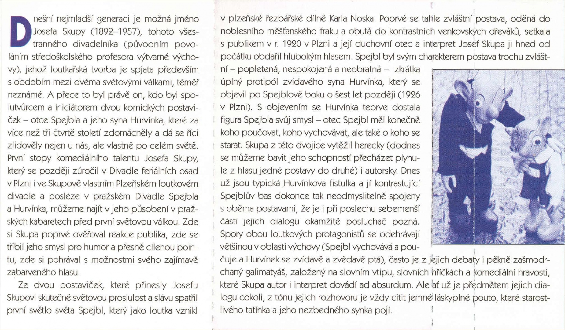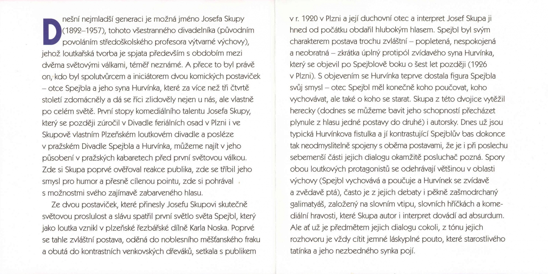 Ze dvou postaviček, které přinesly Josefu Skupovi skutečně světovou proslulost a slávu spatřil první světlo světa Spejbl, který jako loutka vznikl v plzeňské řezbářské dílně Karla Noska. Poprvé se tahle zvláštní postava, oděná do noblesního měšťanského fraku a obutá do kontrastních venkovských dřeváků, setkala s publikem v r. 1920 v Plzni a její duchovní otec a interpret Josef Skupa ji hned od počátku obdařil hlubokým hlasem. Spejbl byl svým charakterem postava trochu zvláštní - popletená, nespokojená a neobratná - zkrátka úplný protipól zvídavého syna Hurvínka, který se objevil po Spejblově boku o šest let později (1926 v Plzni). S objevením se Hurvínka teprve dostala figura Spejbla svůj smysl - otec Spejbl měl konečně koho poučovat, koho vychovávat, ale také o koho se starat. Skupa z této dvojice vytěžil herecky (dodnes se můžeme bavit jeho schopností přecházet plynule z hlasu jedné postavy do druhé) i autorsky. Dnes už jsou typická Hurvínkova fistulka a jí kontrastující Spejblův bas dokonce tak neodmyslitelně spojeny s oběma postavami, zeje i při poslechu sebemenší části jejich dialogu okamžitě posluchač pozná. Spory obou loutkových protagonistů se odehrávají většinou v oblasti výchovy (Spejbl vychovává a poučuje a Hurvínek se zvídavě a zvědavě ptá), často je z jejich debaty i pěkně zašmodrchaný galimatyáš, založený na slovním vtipu, slovních hříčkách a komediální hravosti, které Skupa autor i interpret dovádí ad absurdum. Ale ať už je předmětem jejich dialogu cokoli, z tónu jejich rozhovoru je vždy cítit jemné láskyplné pouto, které starostlivého tatínka a jeho nezbedného synka pojí.