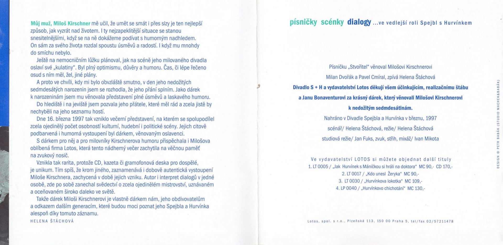 S dárkem pro něj i pro milovníky Kirschnerova humoru přispěchala i Milošova oblíbená firma Lotos, která tento nádherný večer zachytila na věčnou paměť na zvukový nosič.