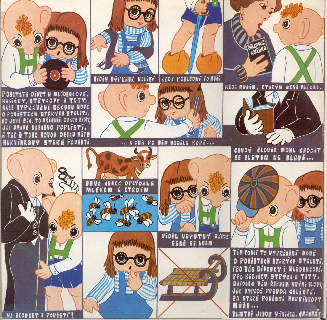Zatímco dřívější vzdělávací desky obsahovaly na jedné straně více příběhů, Hurvínkovy staré pověsti přinesly nový typ výuky. Každá strana obsahovala jedno zahájené a ukončené setkání. Na první straně desky Hurvínek dostane ve škole poznámku kvůli Líbě – míněno kněžně Libuši a Spejbl ho zkouší z Jiráskových pověstí. Další strany zastihovaly rodinku v různých časově neukotvených situacích a děti přiměly s pomocí různých fíglů Spejbla, aby jim vyprávěl pověsti.