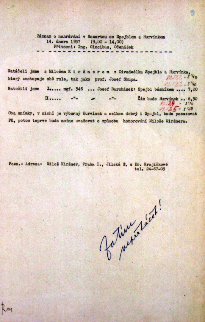 Jedná se sice o první gramodesku v podání Miloše Kirschnera, není to však první dochovaný zvukový záznam Kirschnerova Spejbla a Hurvínka. Již za života Josefa Skupy Kirschner anonymně Skupu alternoval, a tak se stalo, že už v roce 1955 šel do rozhlasu a natočil dosud nevydanou scénku Spejbla a Hurvínka o telefonu, v níž S+H s pionýrem Vašíkem a paní Švitorkovou zapojují domácí telefon a zkouší jeho funkčnost.