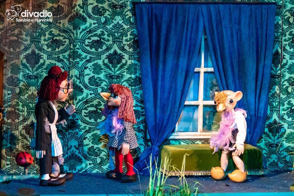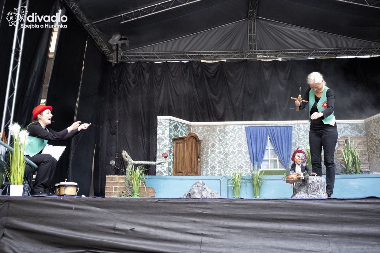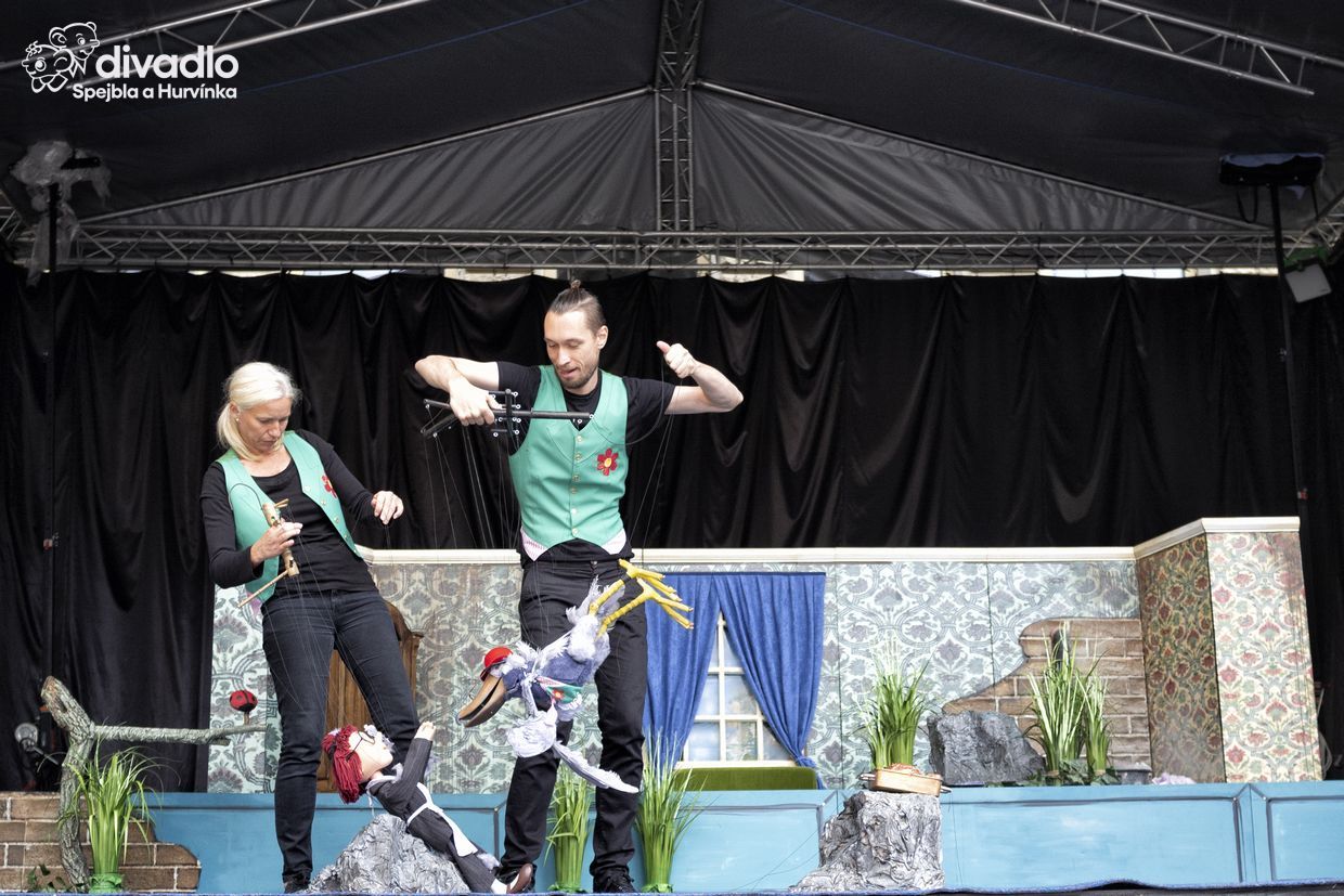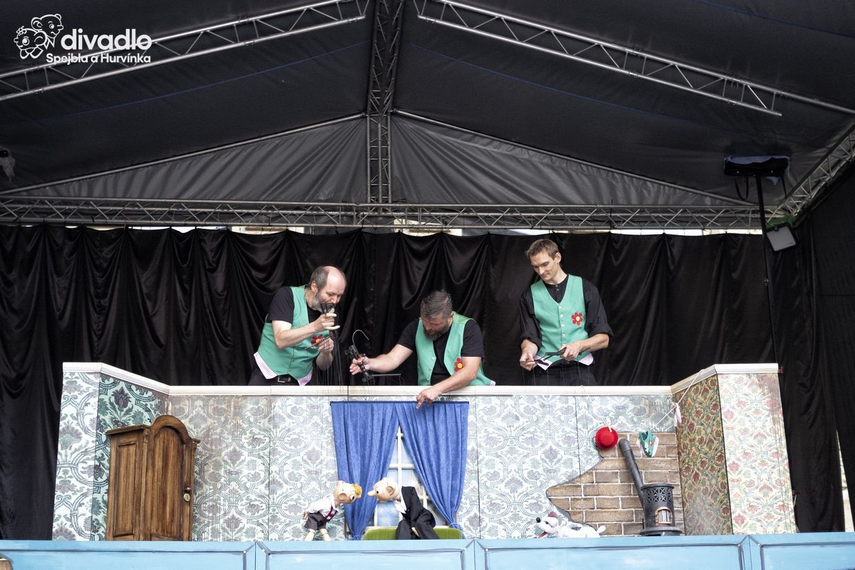 Už jsem zmínil, že diváci mohli sledovat loutkoherce při práci, stejný zážitek však byl nabídnut také v rovině hlasové. Představení pracovalo s tzv. rozdělenou interpretací - loutkoherci vodili, mluviči - v tomto případě pouze dva, seděli každý z jedné strany jeviště obrácení směrem k loutkám. V postavách Spejbla a Hurvínka účinkoval nástupce Martina Kláska Ondřej Lážnovský. Lážnovský kromě titulních figur štěkal psa Žeryka - připomeňme, že s Žeryčkem prožil několik let ještě před svěřením S+H, a rovněž ztvárnil i Člunozobce. Dohromady tak sehrál na jedna ústa čtyři hlasově odlišené postavy a výtečně tak navázal na Martina Kláska, který často hraje více figur najednou. Zahambit se ovšem nedala ani Marie Šimsová, kromě Máničky a Bábinky sehrála i dalšího hrdinu, jehož identitu z důvodů spoilleru neprozradím. Sedění obou mluvičů mělo své praktické důvody, svými těly by zakryli jednající loutky, naopak v písničkách se postavili a zpěvem se přidali ke zbytku souboru. Hravost je D S+H blízká a projevila se i v písních. Refrény či jiné pasáže textů zněly jednak ve sboru všech účinkujících, tu atam zazněla sóla a to buď za dané postavy či sami za sebe. Publikum mělo možnost slyšet i civlní zpěv Ondřeje Lážnovského a Marie Šimsové.
