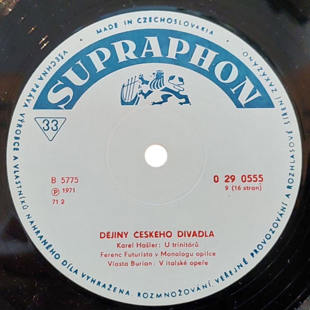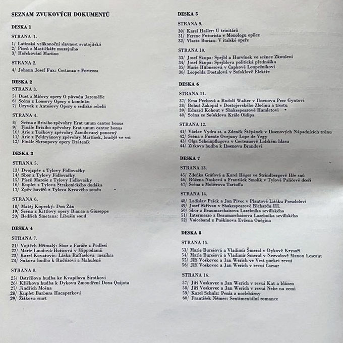 Jedná se o historicky cenné zvukové záznamy s ukázkami z divadelních her, zpěvoher a oper, na kterých jsou zachyceny herecké výkony Karla Kopeckého, Jindřicha Mošny, Eduarda Kohouta, Leopoldy Dostálové, Zdeňka Štěpánka, Václa Vydry, Marie Hübnerové, Karla Hašlera a mnoha dalších včetně dvou scének Josefa Skupy.
