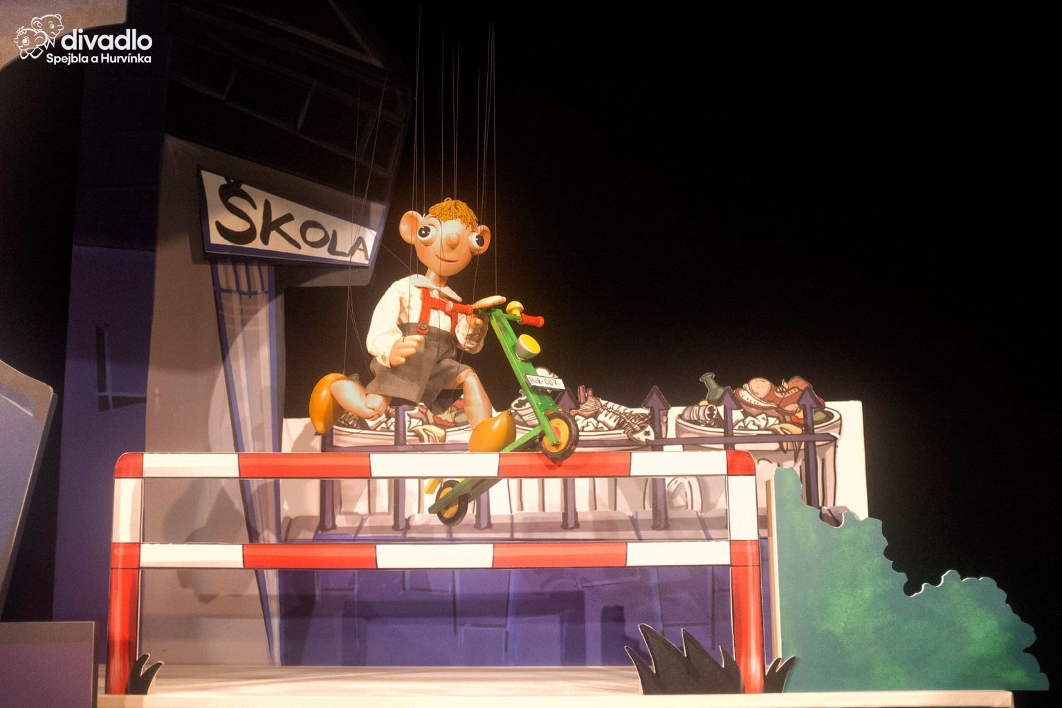 Stejně jako v původní hře, i tentokrát chce Spejbl potrestat nezbedného syna a ve spolupráci s paní Kateřinou se mu rozhodne schovat něco, co je Hurvínkovi blízké. V nové verzi je to jeho milovaná koloběžka, kterou mu ukryjí ve školním kabinetu. A právě Hurvínkovo pátrání po koloběžce je nosným prvkem celého příběhu, který se tak logicky z velké části odehrává v prostorách základní školy či před ní. Na ní s nostalgií vzpomíná i pan Spejbl, který přiznává, že ho s touto budovou pojí krásných 16 let jeho školní docházky. Ve hře nechybí ani jeho další komické výstupy, kdy například „odborně“ otevírá zablokované dveře kabinetu či se „hrdinsky“ schovává mezi Máničku a paní Kateřinu. Ani paní Kateřina se svým sjížděním zábradlí nenechá ve vtipných výstupech zahanbit.