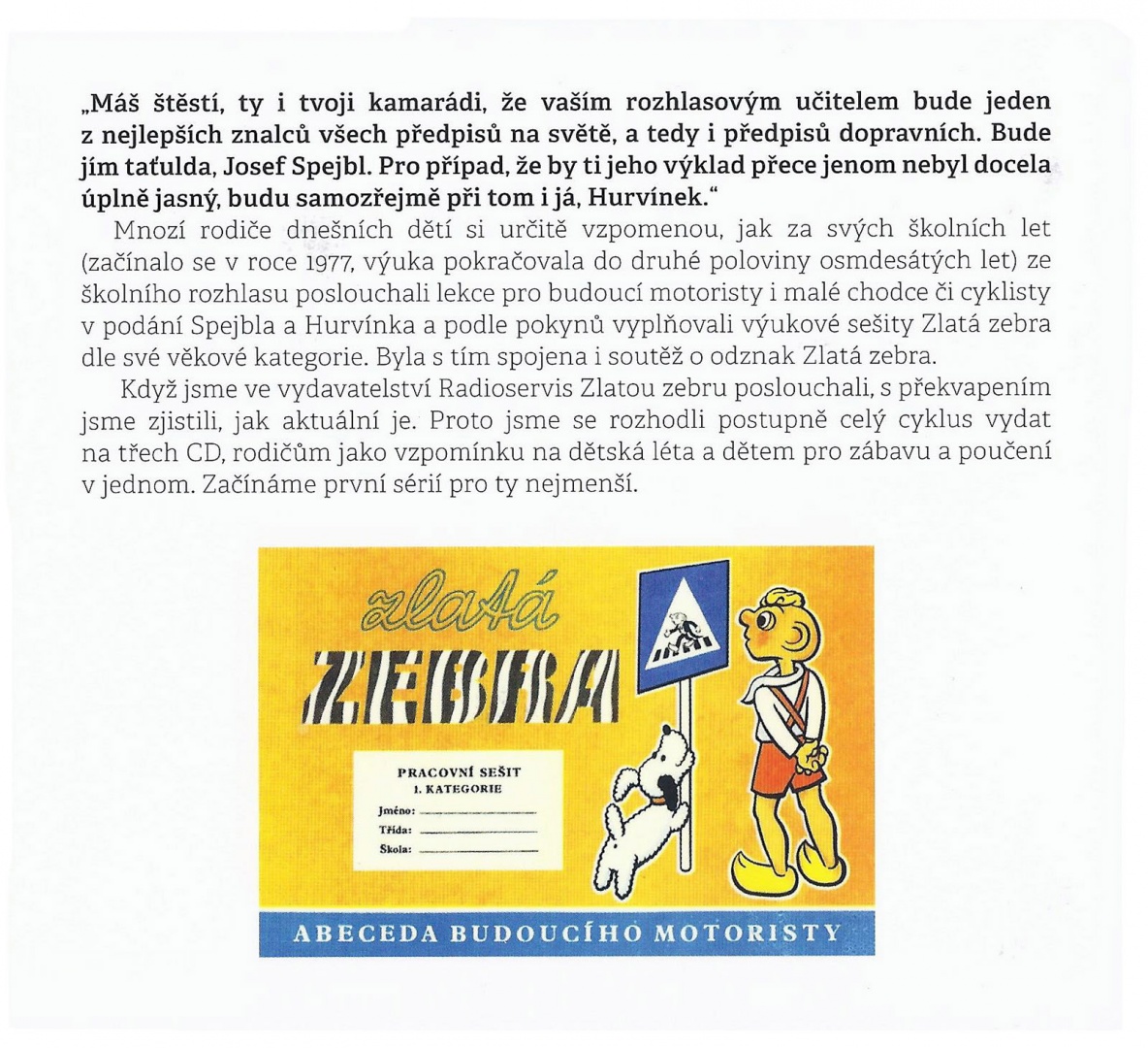 Mnozí rodiče dnešních dětí si určitě vzpomenou, jak za svých školních let (začínalo se v roce 1977, výuka pokračovala do druhé poloviny osmdesátých let) ze školního rozhlasu poslouchali lekce pro budoucí motoristy i malé chodce či cyklisty v podání Spejbla a Hurvínka a podle pokynu vyplňovali výukové sešity Zlatá zebra dle své věkové kategorie. Byla s tím spojena soutěž o odznak Zlatá zebra.