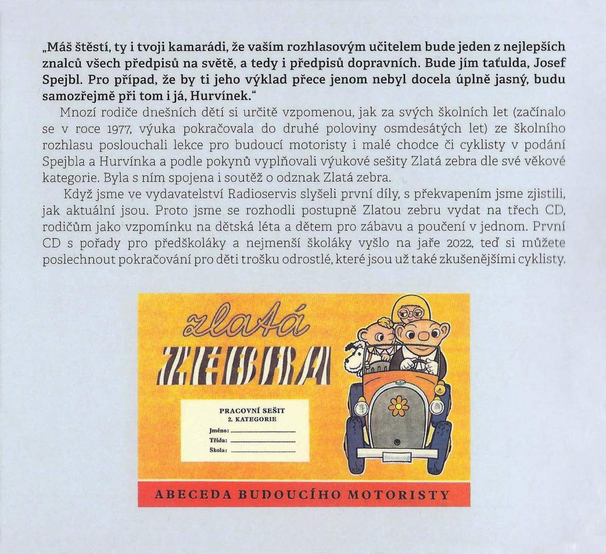 Když jsme ve vydavatelství Radioservis slyšeli první díly, s překvapením jsme zjistili, jak aktuální jsou. Proto jsme se rozhodli postupně Zlatou zebru vydat na třech CD, rodičům jako vzpomínku na dětská léta a dětem pro zábavu a poučení v jednom. První CD s pořady pro předškoláky a nejmenší školáky vyšlo v červnu 2022, teď si můžete poslechnout pokračování pro děti odrostlejší, které jsou už také zkušenějšími cyklisty.
