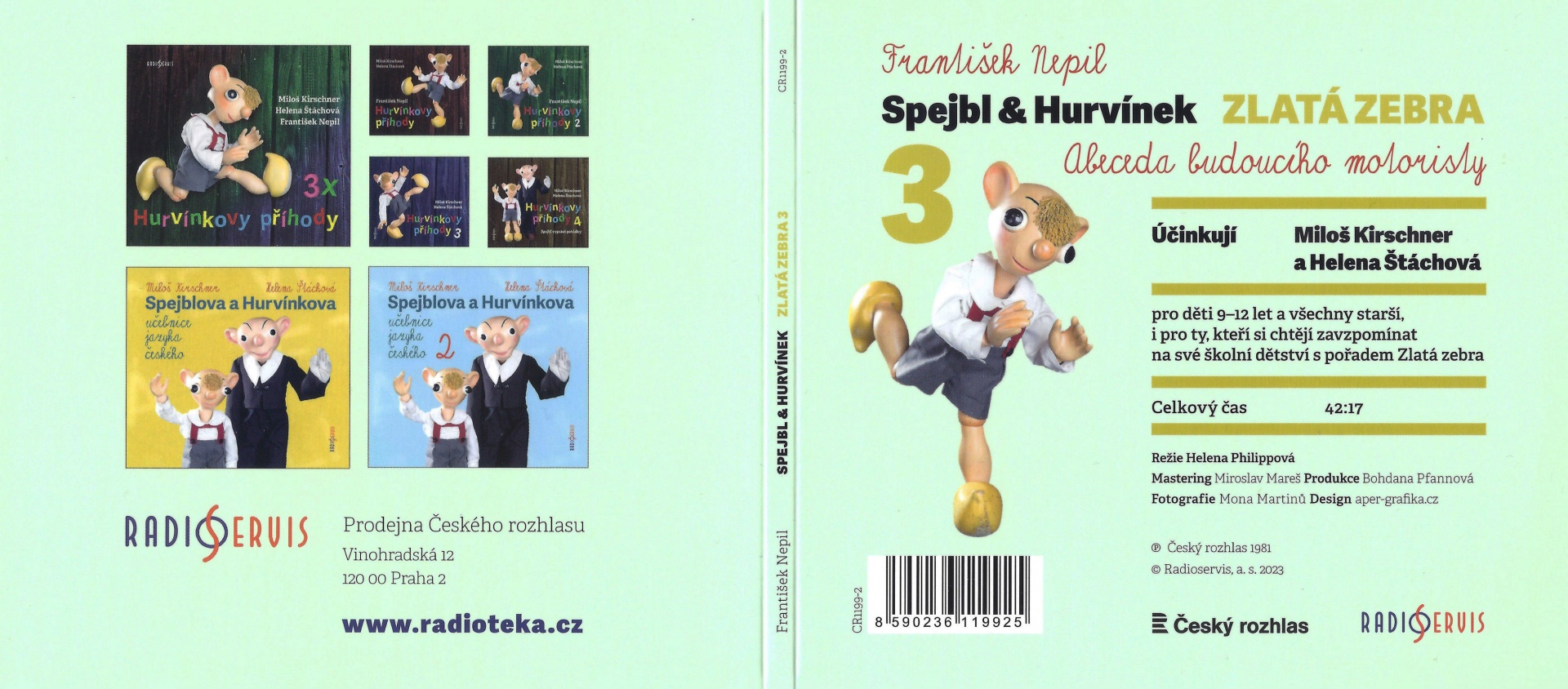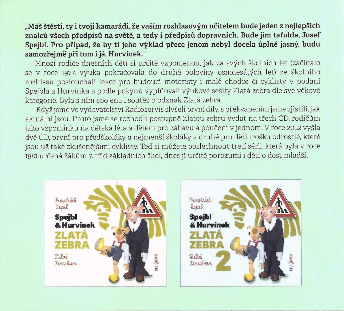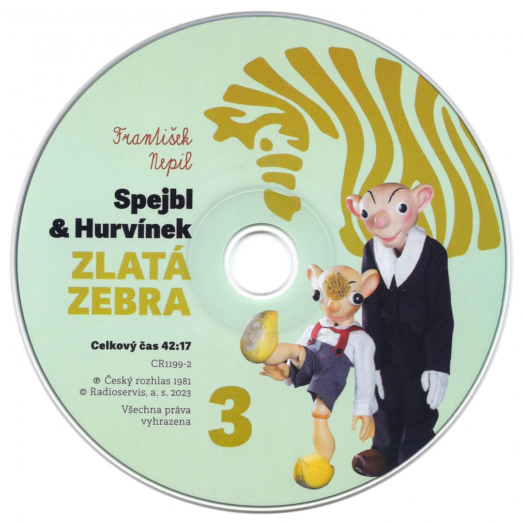„Máš štěstí, ty i tvoji kamarádi, že vaším rozhlasovým učitelem bude jeden z nejlepších znalců všech předpisů na světě, a tedy i předpisů dopravních. Bude jím taťulda, Josef Spejbl. Pro případ, že by ti jeho výklad přece jenom nebyl docela úplně jasný, budu samozřejmě při tom i já, Hurvínek.“ Mnozí rodiče dnešních dětí si určitě vzpomenou, jak za svých školních let (začínalo se v roce 1977, výuka pokračovala do druhé poloviny osmdesátých let) ze školního rozhlasu poslouchali lekce pro budoucí motoristy i malé chodce či cyklisty v podání Spejbla a Hurvínka a podle pokynů vyplňovali výukové sešity Zlatá zebra dle své věkové kategorie. Byla s ním spojena i soutěž o odznak Zlatá zebra. Když jsme ve vydavatelství Radioservis slyšeli první díly, s překvapením jsme zjistili, jak aktuální jsou. Proto jsme se rozhodli postupně Zlatou zebru vydat na třech CD, rodičům jako vzpomínku na dětská léta a dětem pro zábavu a poučení v jednom. V roce 2022 vyšla dvě CD, první pro předškoláky a nejmenší školáky a druhé pro děti trošku odrostlé, které jsou už také zkušenějšími cyklisty. Teď si můžete poslechnout třetí sérii, která byla v roce 1981 určená žákům 7. tříd základních škol, dnes jí určitě porozumí i děti o dost mladší.