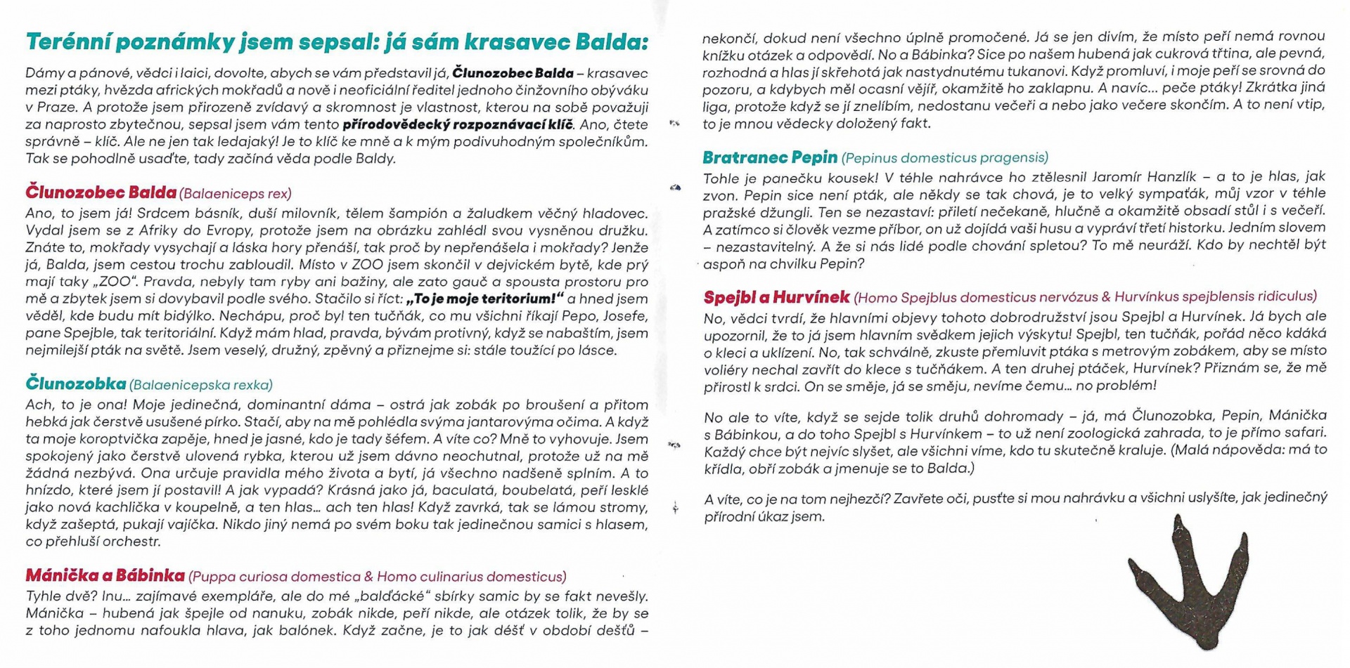 Dámy a pánové, vědci i laici, dovolte, abych se vám představil já, Člunozobec Balda - krasavec mezi ptáky, hvězda afrických mokřadů a nově i neoficiální ředitel jednoho činžovního obýváku v Praze. A protože jsem přirozeně zvídavý a skromnost je vlastnost, kterou na sobě považuji za naprosto zbytečnou, sepsal jsem vám tento přírodovědecký rozpoznávací klíč. Ano, čtěte správně - klíč. Ale ne jen tak ledajaký! Je to klíč ke mně a k mým podivuhodným společníkům. Tak se pohodlně usaďte, tady začíná věda podle Baldy.