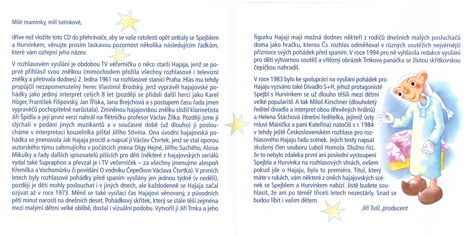 Obdobou TV večerníčku je v rozhlasovém vydání o pár let starší Hajaja, pohádka před spaním vysílaná pro děti na stanici Českého rozhlasu Praha. Těší se už pět desetiletí velké oblibě. Hajaja je spojen se jmény dlouhé řady herců a mezi postavičkami, které dětem přiblížil, mají své místo i Spejbl a Hurvínek. Miloš Kirschner, dlouholetý ředitel Divadla S+H a interpret obou dřevěných hrdinů a Helena Štáchová, dnešní ředitelka divadla, jejímiž ústy mluví Mánička a paní Kateřina, natočili v roce 1984 v tehdy ještě Československém rozhlase pro rozhlasového Hajaju řadu scének, které se téhož roku vysílaly a později často reprízovaly. Na tomto titulu vám některé z nich nabízíme, a jistě budete souhlasit, že ani po téměř třiceti letech nezestárly!