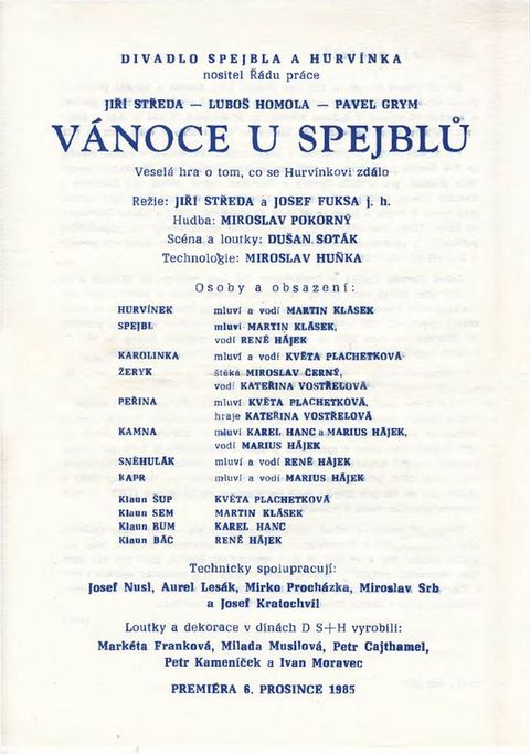 Hurvínek: Martin Klásek; Spejbl-mluví: Martin Klásek; Spejbl-vodí: René Hájek; Karolinka: Květa Plachetková; Žeryk-štěká: Miroslav Černý; Žeryk-vodí: Kateřina Vostřelová; Peřina-mluví: Květa Plachetková; Peřina-hraje: Kateřina Vostřelová; Kamna-mluví: Karel Hanc; Kamna-mluví: Marius Hájek; Kamna-vodí: Marius Hájek; Sněhulák: René Hájek; Kapr: Marius Hájek; Klauni Šup: Květa Plachetková; Sem: Martin Klásek; Bum: Karel Hanc; Bác: René Hájek