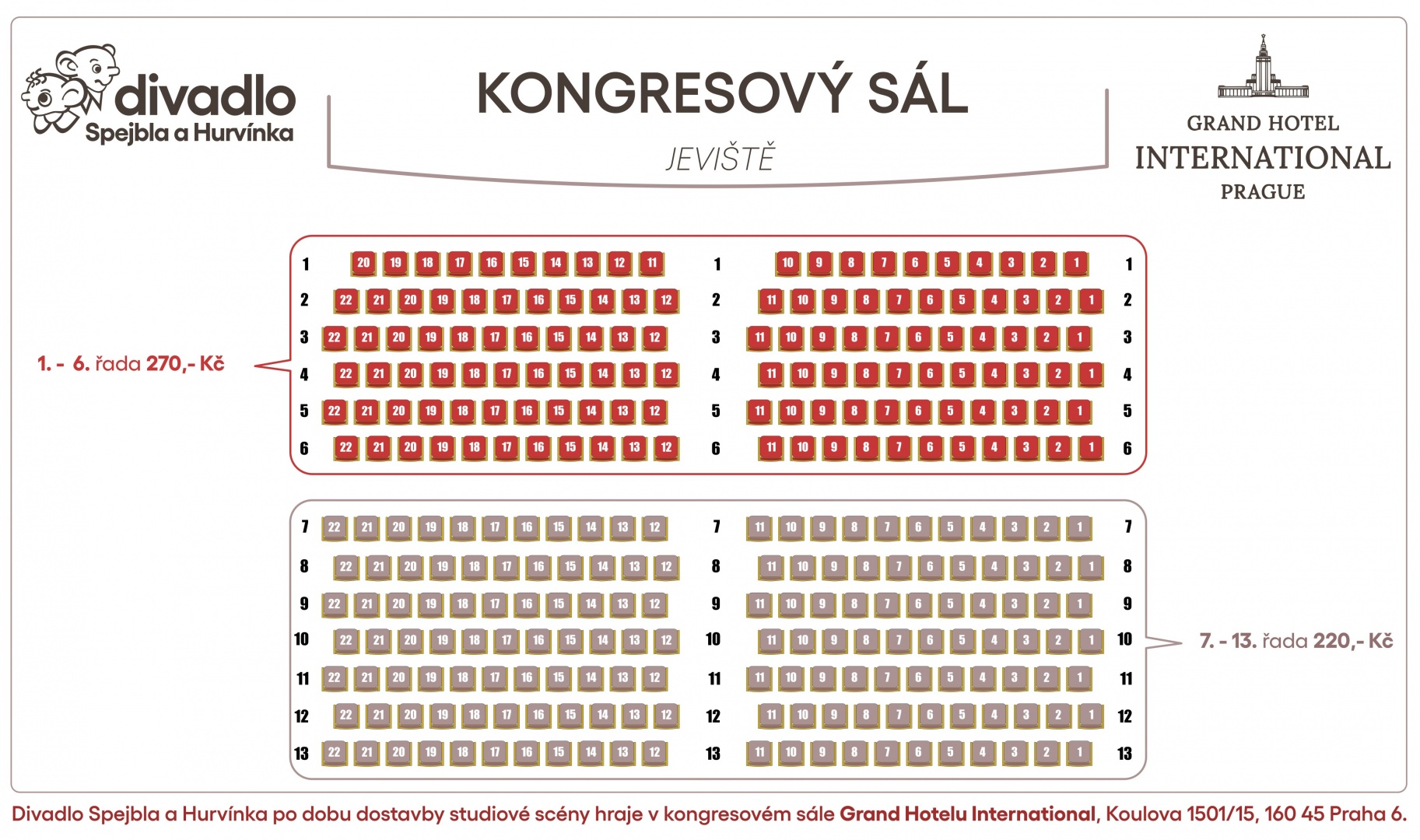 Do dočasného hotelového azylu budou moci diváci zajít v první půlce dubna celkově 6x na hru Hurvínkova cesta do Tramtárie, 3x na inscenaci Hurvínkův popletený víkend a 2x bude k vidění Hurvínek a nezvaný host. Na repertoáru bude i miminí inscenace Hurvínkovo moře snění - ta je ale už beznadějně vyprodaná. Za vstupenky na představení uváděná v Grand Hotelu International zaplatíte za místa od první do šesté řady 270 Kč, resp. 220 Kč za sedadla v 7. až 13. řadě.