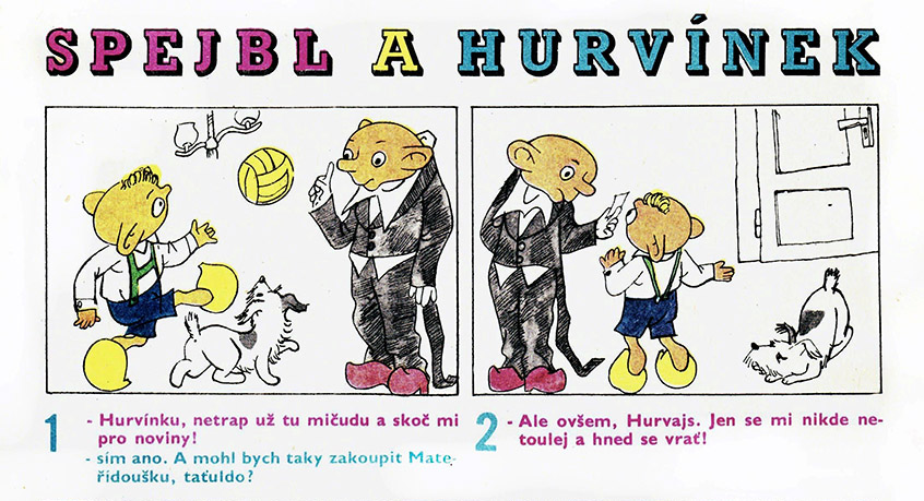 Jedním z prvních dohledatelných komiksů se Spejblem a Hurvínkem, možná dokonce úplně prvním, bylo v roce 1964 kreslené blahopřání Radko Hakena uveřejněné v časopisu Mateřídouška. Otištěno bylo na poslední stránce ve dvacátém ročníku oblíbeného magazínu pro nejmenší děti jako připomínka kulatého výročí vydávání tohoto časopisu.