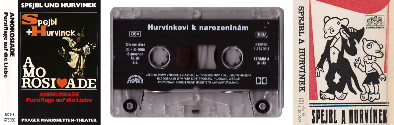 Podobně starou, nebo možná o něco málo mladší, než zmíněný český výběr, by mohla být německá MC kazeta Spejbl+Hurvínek Amorosiade se záznamem divadelní hry pro dospělé diváky Amorosiáda. Tato nahrávka je velkou raritou v Hurvínkově zvukové historii, neboť jde je záznam živého vystoupení s publikem v západním Německu. Nahrávací přístroje snímek pořídily v listopadu 1971 a je to zatím jediný vydaný zvukový doklad uceleného Kirschnerova představení před diváky. S přihlédnutím k datu pořízení záznamu je však možné, že nahrávka se do prodeje nedostala ještě týž rok, ale až později a může tedy být stejně stará, nebo dokonce mladší než výše uvedený supraphonní výběr. Stejně tak je dost dobře možné, že MC kazeta nebyla vydána ve stejné době jako gramofonová deska, ale až o několik let později. Přestože máme v našem přehledu díky jednomu zapálenému sběrateli kompletní sken obalu této magnetofonové kazety, pravdu se patrně nikdy přesně nedozvíme, protože stejně jako u gramodesky, tak ani na obalu kazety (ani kazetě samotné), žádné datum vydání uvedeno není.