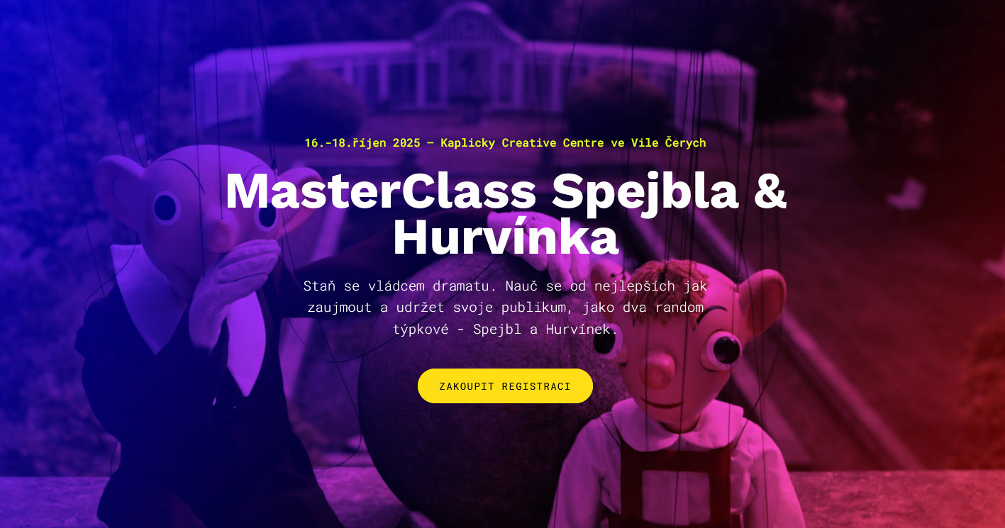 Tato MasterClass proto není jen rezidenčním setkáním v inspirativním prostředí zrekonstruované vily Čerych. Je to třídenní cesta k objevení vlastního potenciálu: intenzivní ponoření do tvůrčí práce, při němž budete bydlet, stolovat i tvořit spolu s lektory. Díky osobnímu vedení objevíte nejen historii divadla, způsob tvůrčího psaní, ale také se setkáte s loutkoherectvím a vyzkoušíte si specifickou hereckou práci, která obnáší nejen loutkářské řemeslo, ale i kus sebevědomého přístupu v rámci osobní prezentace na jevišti.