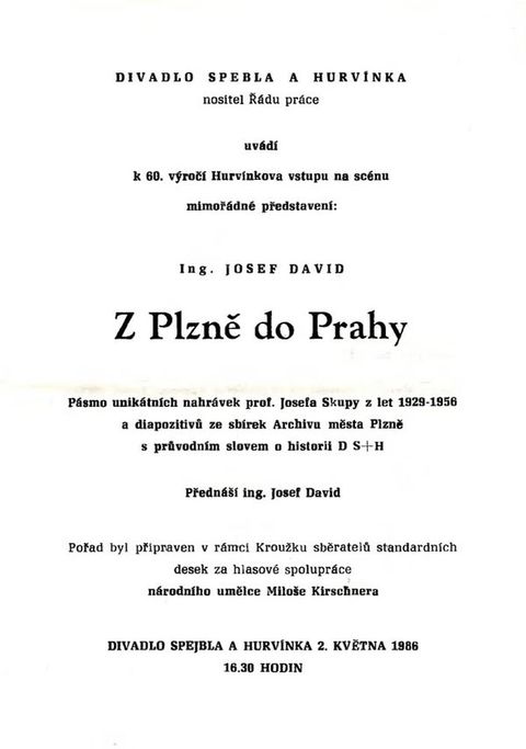 první provedení 3.9.1956 v Plzni, II. premiéra 31.12.1956 v Praze byla posledním vystoupením Josef Skupy
