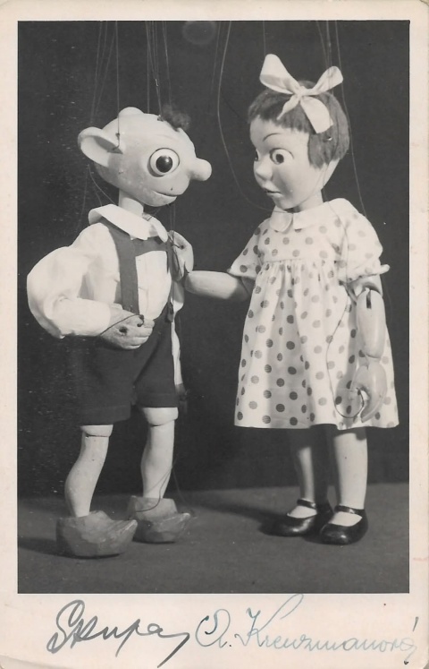 Pohlednice na motivy seriálu "Znovu u Spejbla a Hurvínka". Výtvarník scén: Zdeněk Juřena, foto: Josef Žák, tisk: OTK Hradištko pod Medníkem, nakladatelství: Svépomoc, Praha