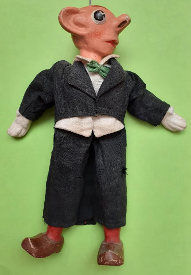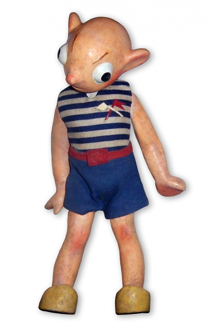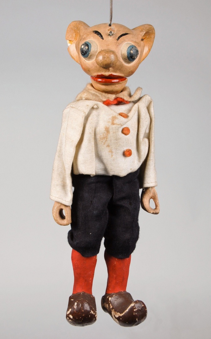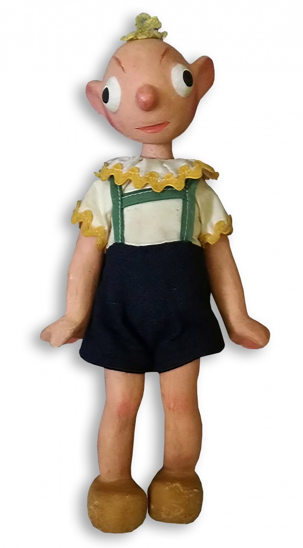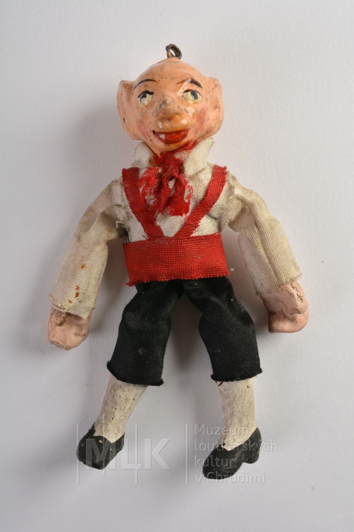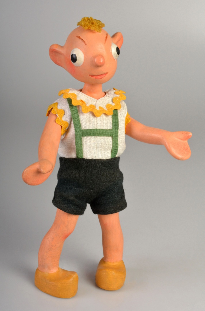 Hračkový Hurvínek (loutka s výkyvnou hlavou a pohyblivými údy), vyráběná od roku 1949 z trvanlivé hmoty podle návrhu akademické malířky a sochařky Marie Borkové-Fischerové.