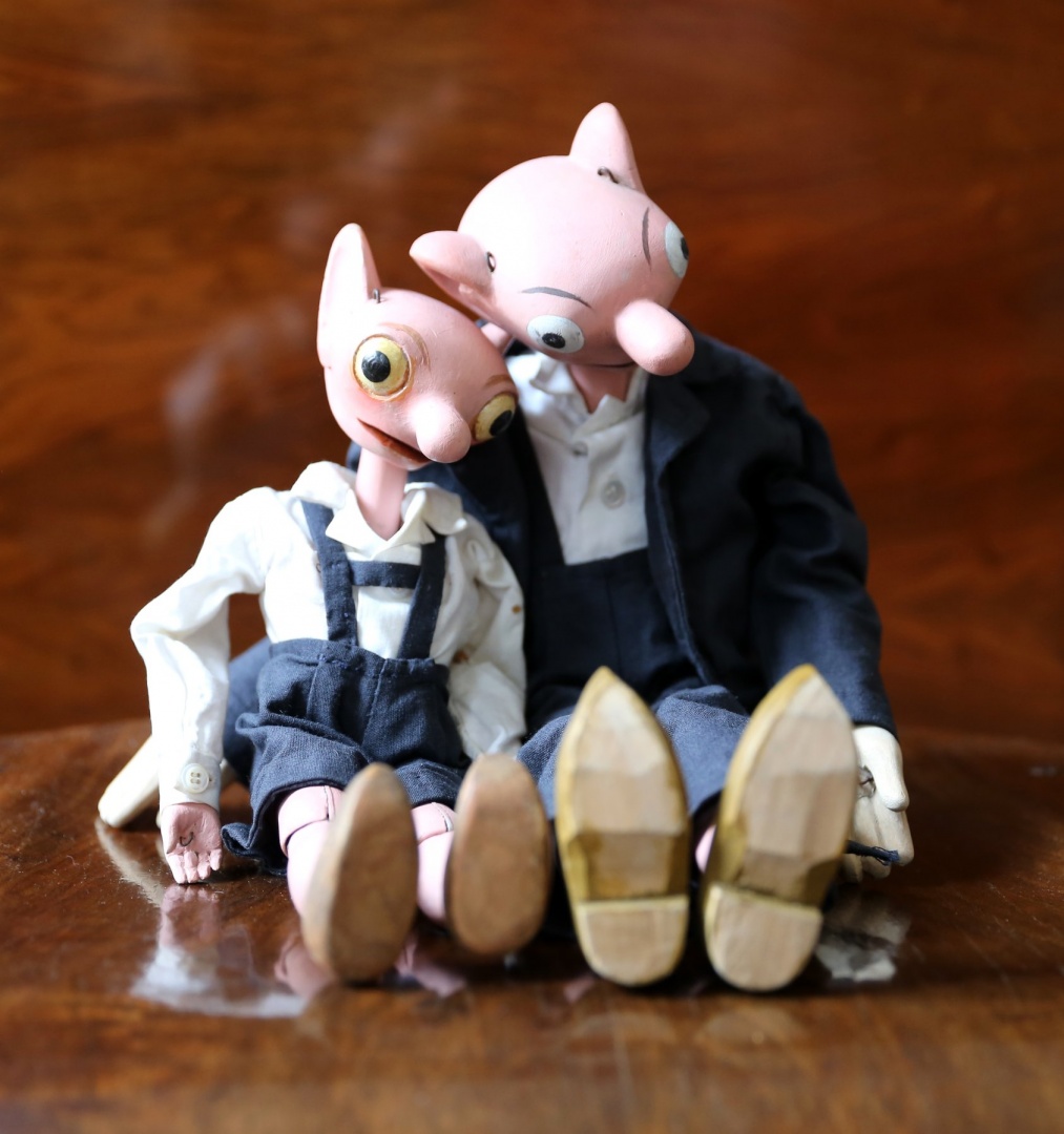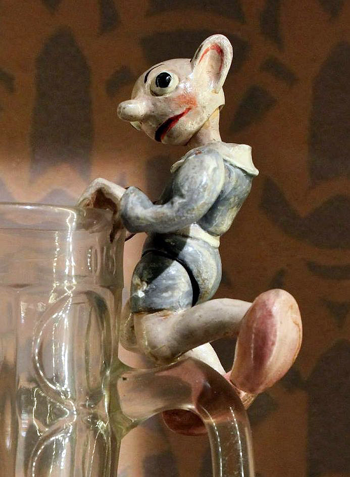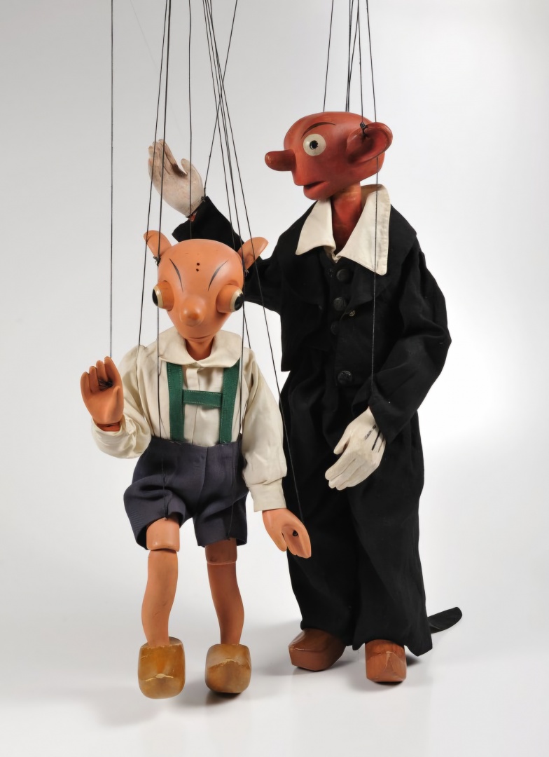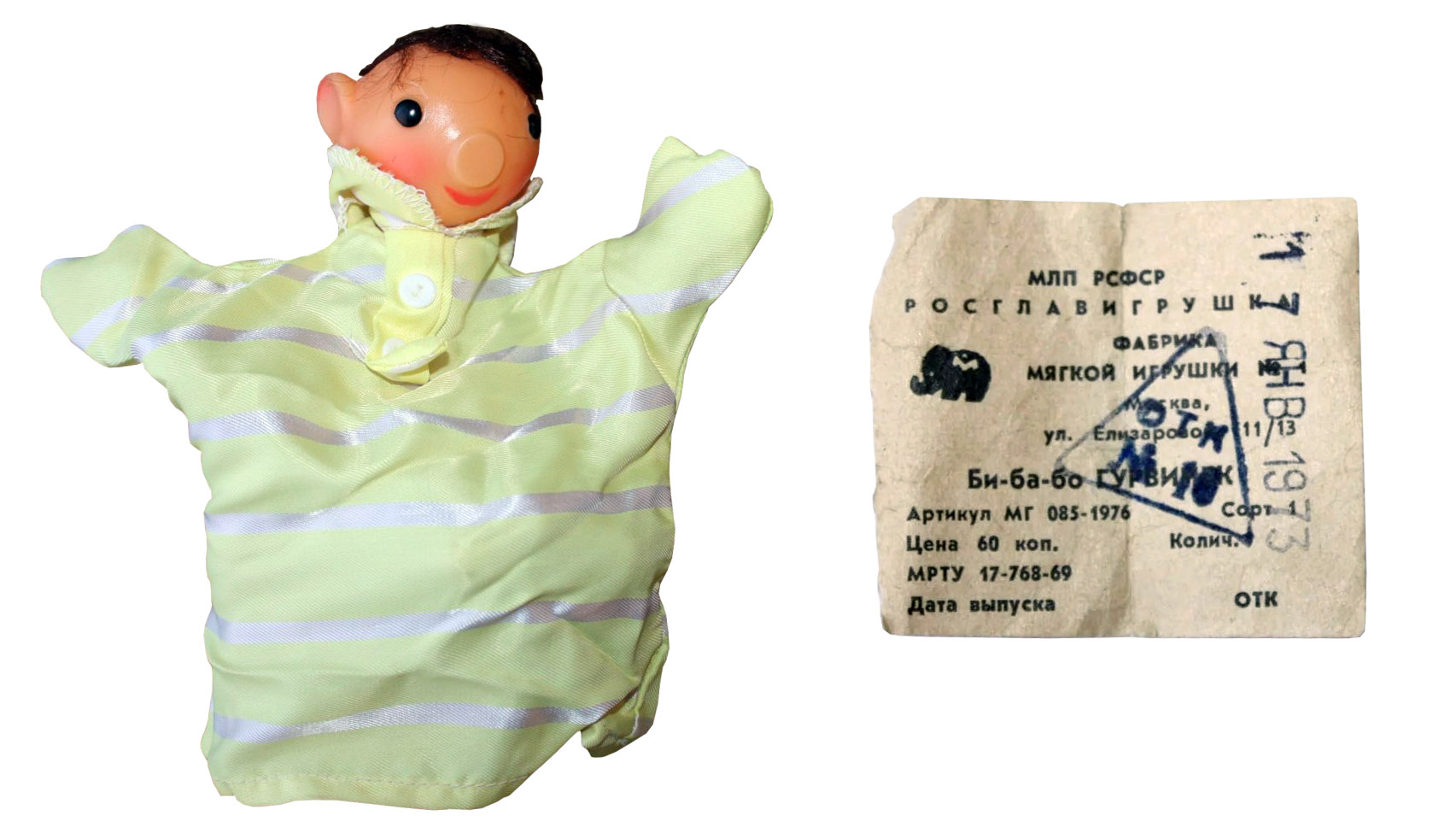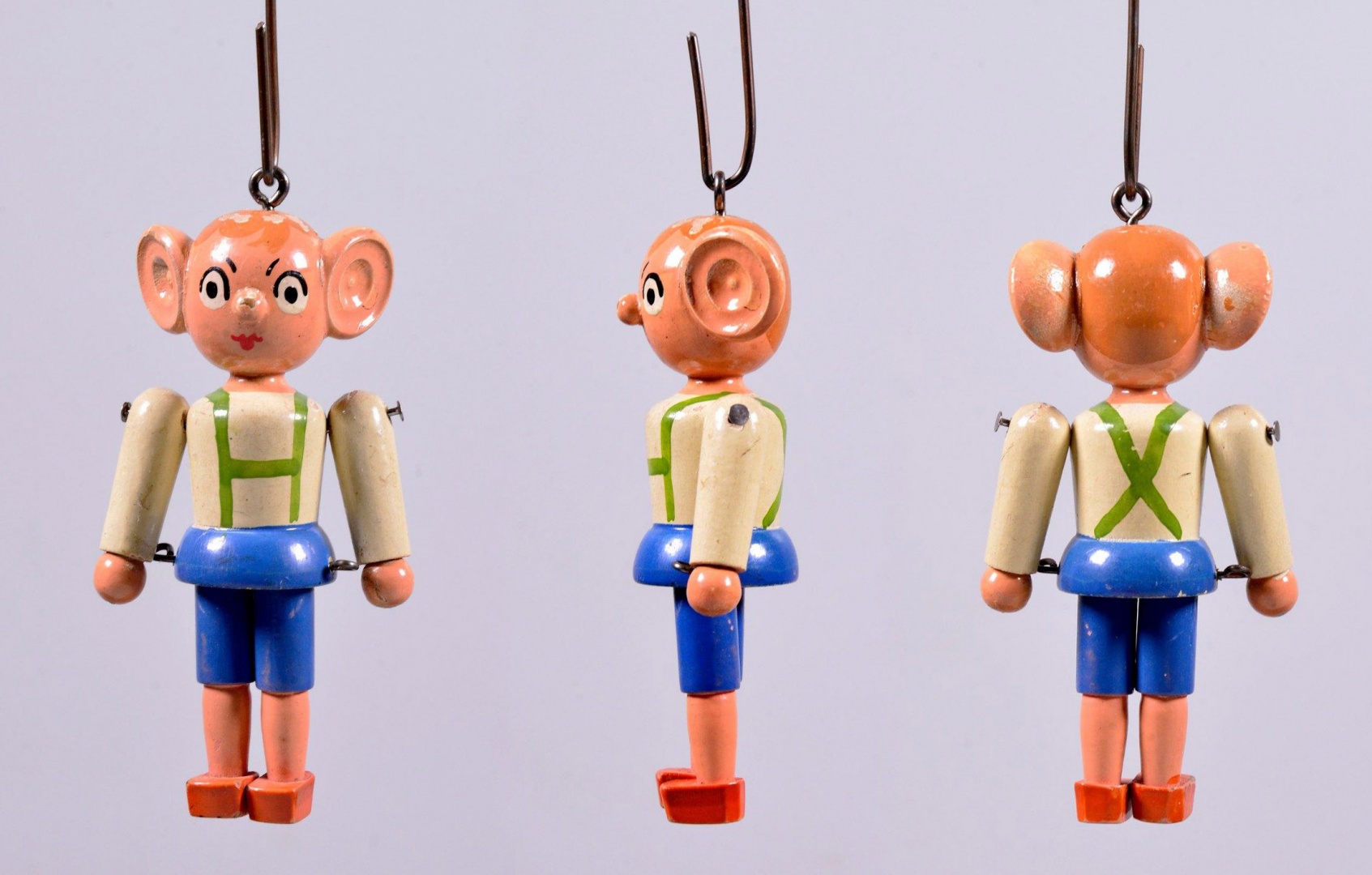 Hračkový Hurvínek (loutka s výkyvnou hlavou a pohyblivými údy), vyráběná od roku 1949 z trvanlivé hmoty podle návrhu akademické malířky a sochařky Marie Borkové-Fischerové.