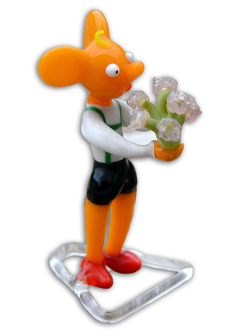 Skleněný Hurvínek s kyticí (J. Brychta, cca 1955), výška 7 cm