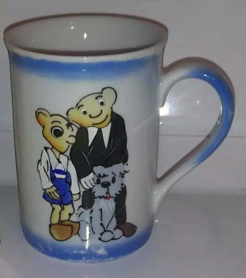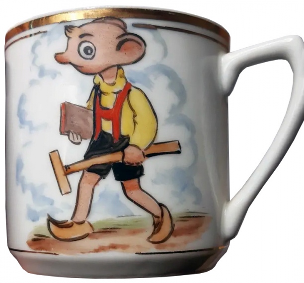 Ručně malovaný hrnek s Hurvínkem se zlatým lemem z druhé poloviny 20. století (výška 7 cm, průměr okraje 7 cm, na opačné straně obrázek mochomůrky, výrobce: Karlovarský porcelán n.p., porcelánka Lesov).