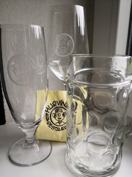 Další skleničky a pivní půllitr pocházejí z drážďanské restaurace Hurvínek.