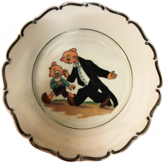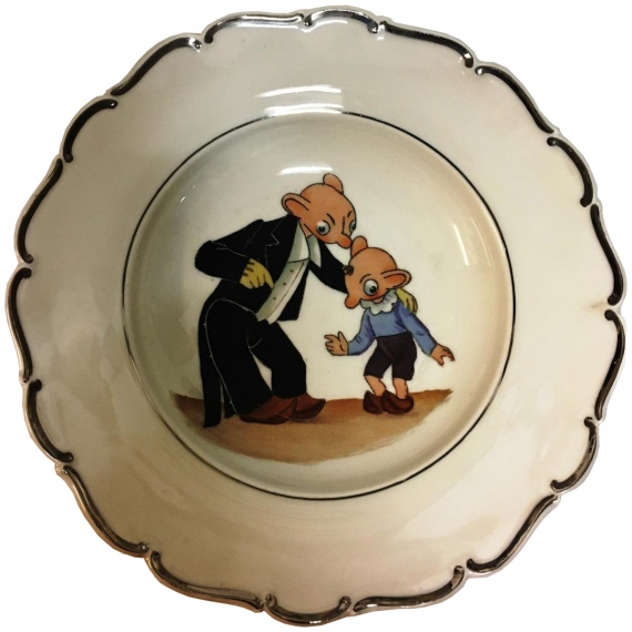 Sada českých ručně malovaných talířů se stříbrným okrajem z poloviny 20. století. Sada obsahovala 3 ks talířů (mělký, hluboký a dezertní). Průměry talířů 20 resp. 17 cm.