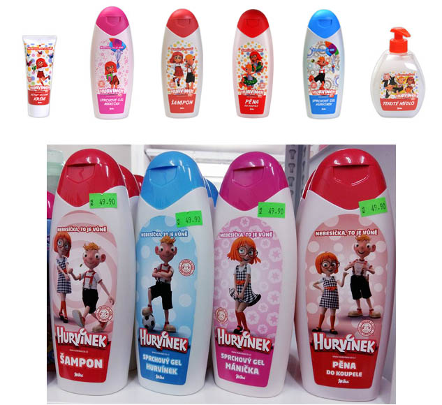 Drogistické mycí prostředky (šampón, pěna do koupele, sprchový gely, krémy) s motivem Hurvínka ve filmu resp. filmu Hurvínek a kouzelné muzeum. Adonis Sprchový gel a koupelová pěna - Spejbl 70 ml (EAN: 8594023225530) - Balící papír