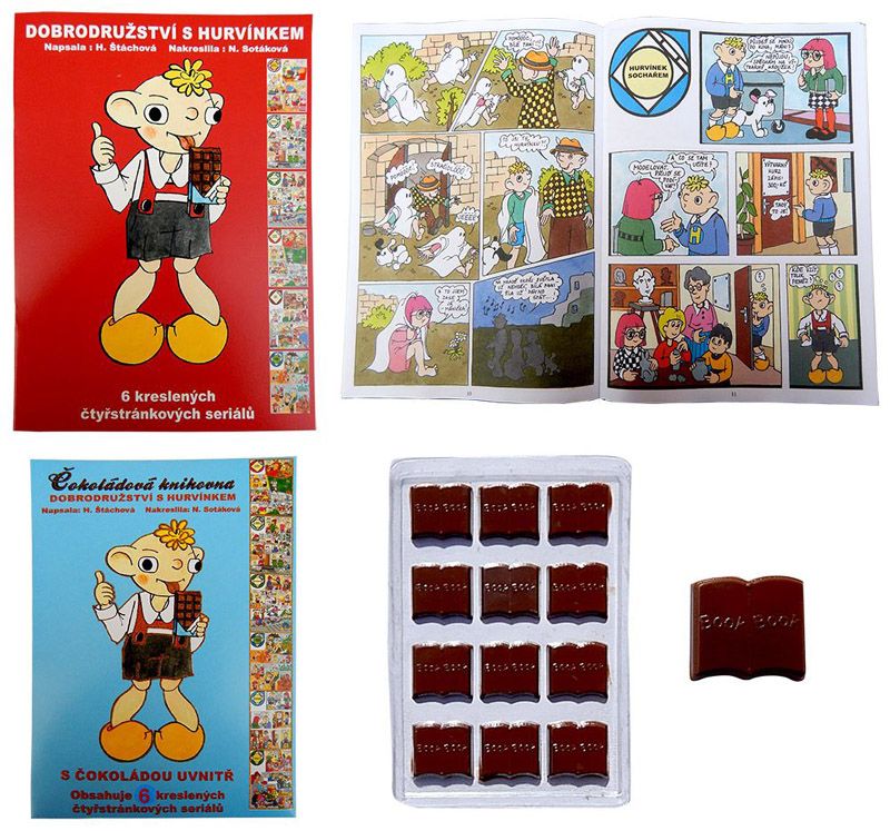 Výrobce: Čokoládovny Fikar. Adventní kalendář A4 40 g (bez CD) a 50g (s CD). - Čokoládová knihovna + časopis Čokoládová knihovna 60g spolu s Komiksem Hurvínek (napsala Helena Štáchová, nakreslila Naďa Sotáková).