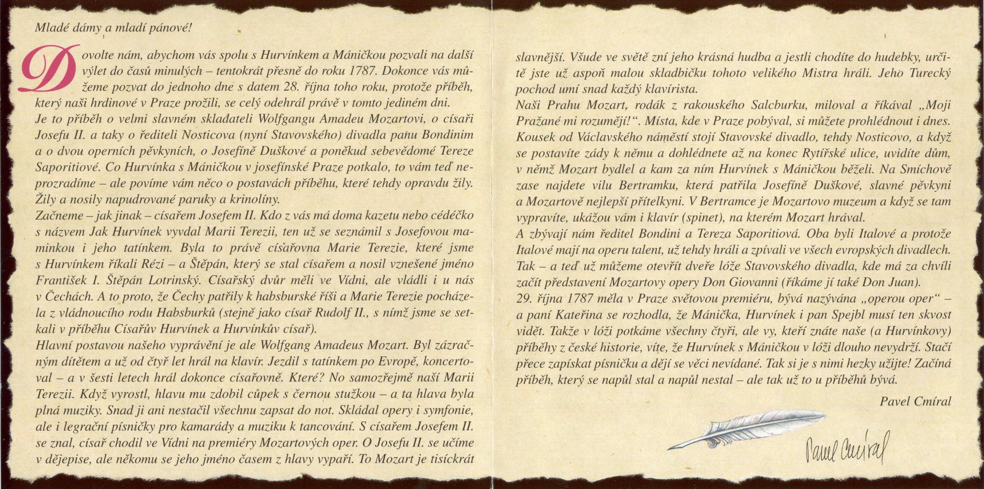 dovolte nám, abychom vás spolu s Hurvínkem a Máničkou pozvali na další výlet do časů minulých - tentokrát přesně do roku 1787. Dokonce vás můžemě pozvat do jednoho dne s datem 28. října toho roku, protože příběh, který naši hrdinové v Praze prožili, se celý odehrál právě v tomto jediném dni. Je to příběh o velmi slavném skladateli Wolfgangu Amadeu Mozartovi, o císaři Josefu II. a taky o řediteli Nosticova (nyní Stavovského) divadla panu Bondinim a o dvou operních pěvkyních, o Josefíně Duškové a poněkud sebevědomé Tereze Saporitiové. Co Hurvínka s Máničkou v josefínské Praze potkalo, to vám teď neprozradíme - ale povíme vám něco o postavách příběhu, které tehdy opravdu žily. Žily a nosily napudrované paruky a krinolíny.