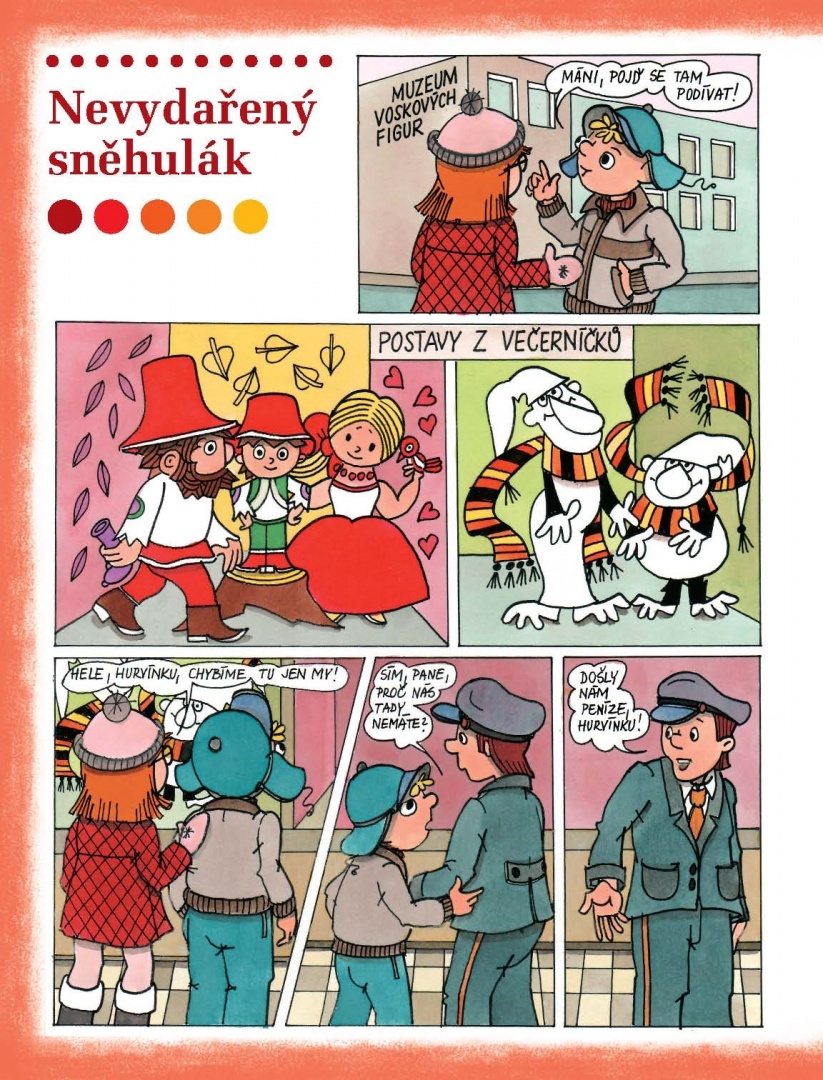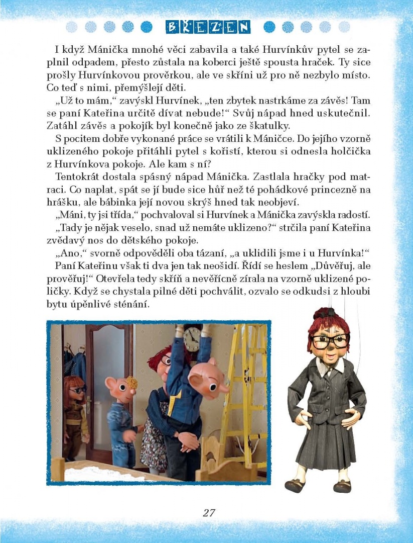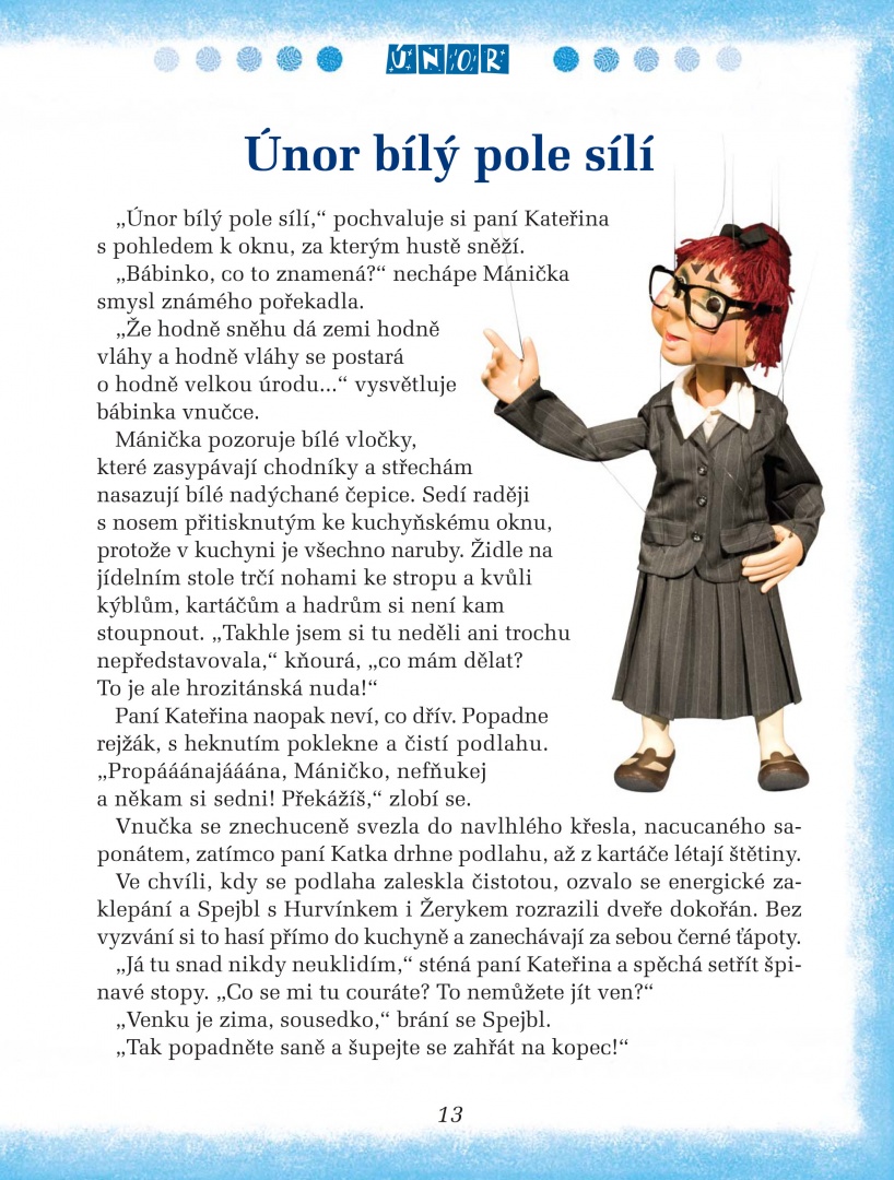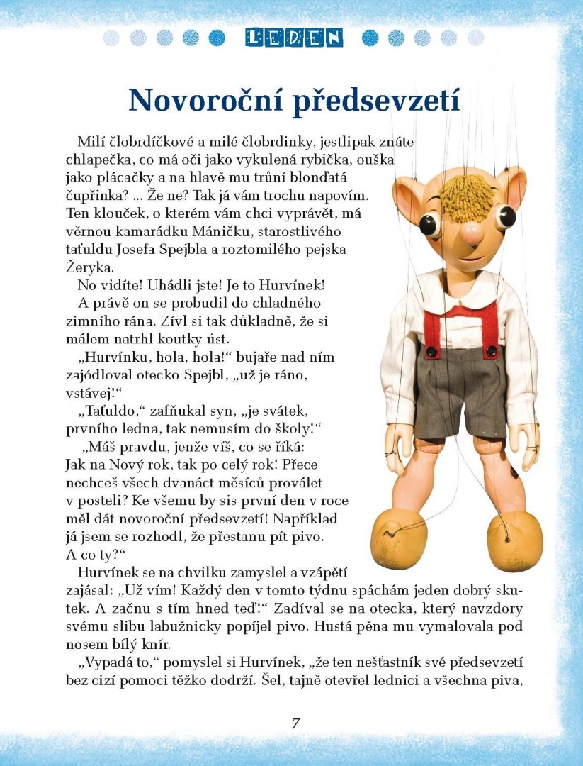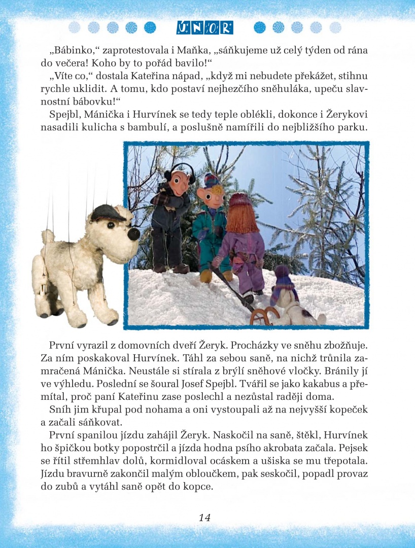 V této knížce přinášíme dvanáct příběhů – stejně jako je měsíců v roce: v lednu si dává Spejbl novoroční předsevzetí a nutí k tomu i Hurvínka, v únoru si všichni vychutnávají sněhovou nadílku, v březnu se začíná hlásit jaro a bábinka je vítá jarním úklidem... a tak se měsíc po měsíci dostaneme až k Vánocům v prosinci. To budete koukat, co všechno se dá během jednoho roku zažít a vymyslet. Legrace prošpikovaná občas ponaučením opravdu nechybí. Zkrátka máme je tu všechny ve vší parádě a lesku a můžeme se s nimi bavit a smát každý den. Příběhů je vlastně celkem osmnáct – šest z nich komiksových! Cháchá!