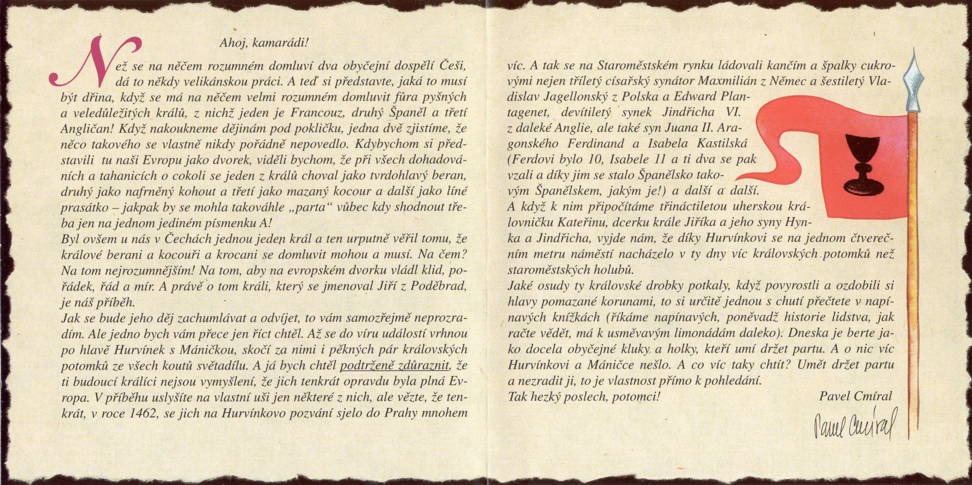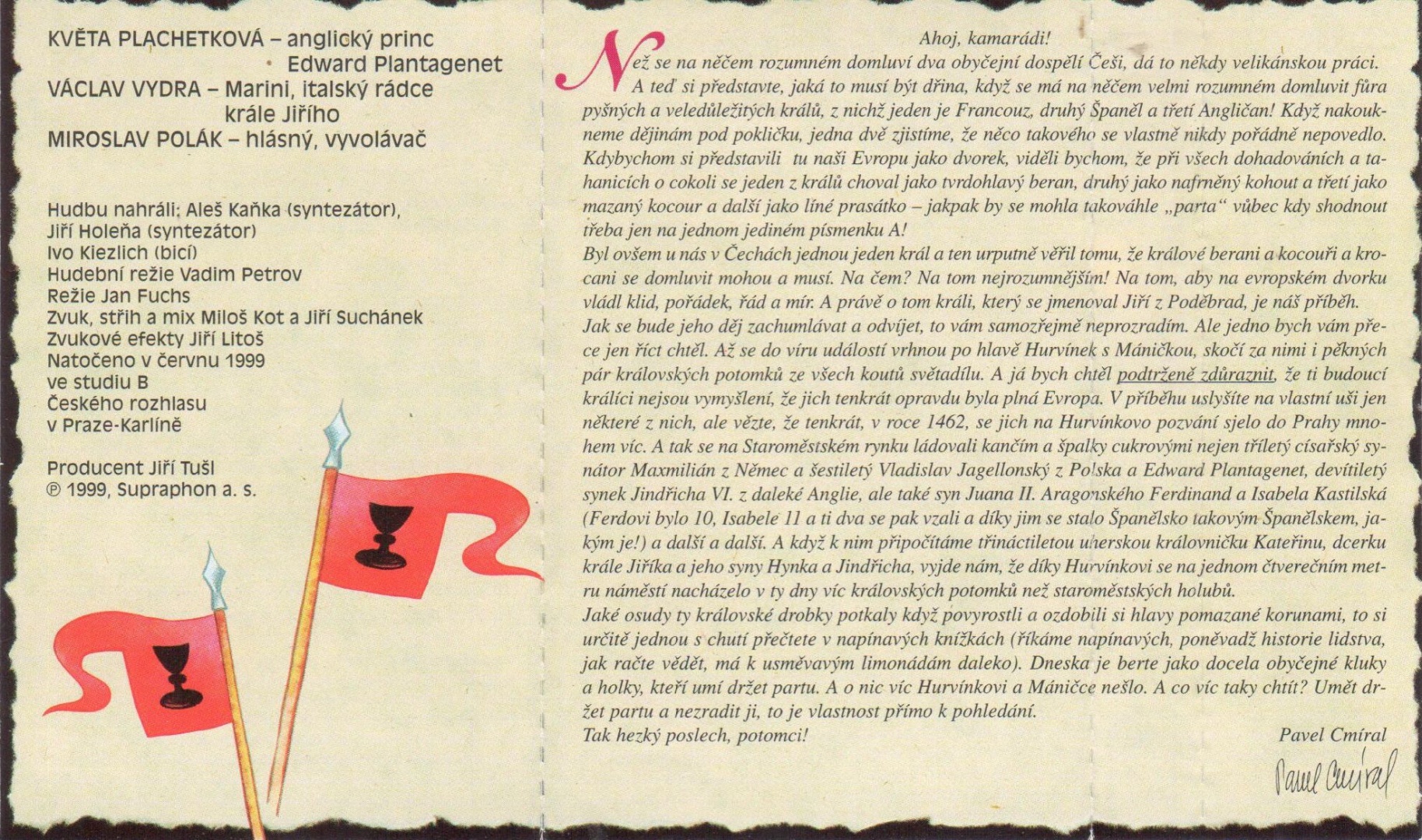 Byl ovšem u nás v Čechách jednou jeden král a ten urputně věřil tomu, ze králové berani a kocouři a krocani se domluvit mohou a musí. Na čem? Na tom nejrozumnějším! Na tom, aby na evropském dvorku vládl klid, pořádek, řád a mír. A právě o tom králi, který se jmenoval Jiří z Poděbrad, je náš příběh.