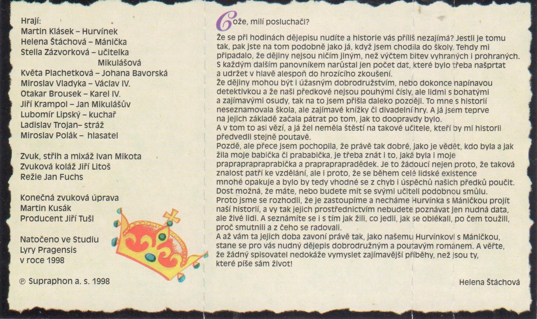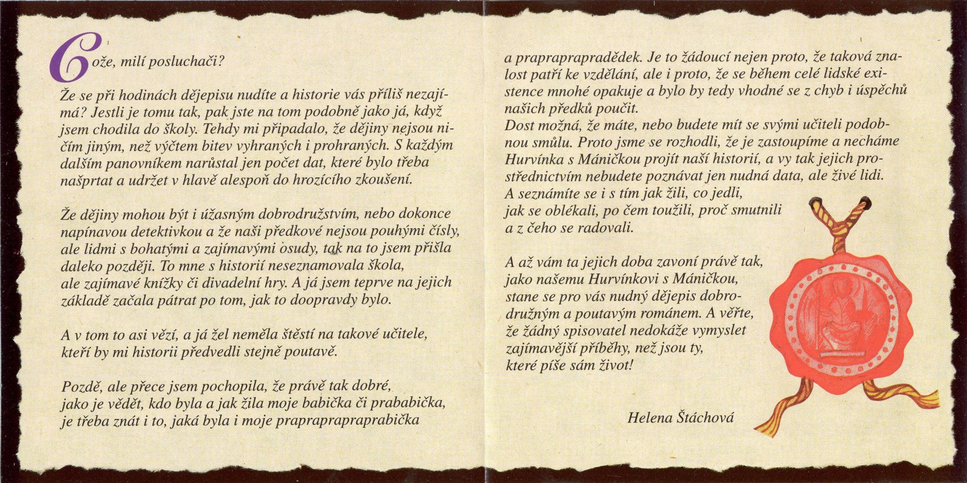 prapraprapraprabička a prapraprapradědek. Je to žádoucí nejen proto, že taková znalost patří ke vzdělání, ale i proto, že se během celé lidské existence mnohé opakuje a bylo by tedy vhodné se z chyb i úspěchů našich předků poučit. Dost možná, že máte, nebo budete mít se svými učiteli podobnou smůlu. Proto jsme se rozhodli, zeje zastoupíme a necháme Hurvínka s Máničkou projít naší historií, a vy tak jejich prostřednictvím nebudete poznávat jen nudná data,ale živé lidi. A seznámíte se i s tím jak žili, co jedli, jak se oblékali, po čem toužili, proč smutnili a z čeho se radovali. A až vám ta jejich doba zavoní právě tak, jako našemu Hurvínkovi s Máničkou, stane se pro vás nudný dějepis dobrodružným a poutavým románem. A věřte, že žádný spisovatel nedokáže vymyslet zajímavější příběhy, než jsou ty, které píše sám život!