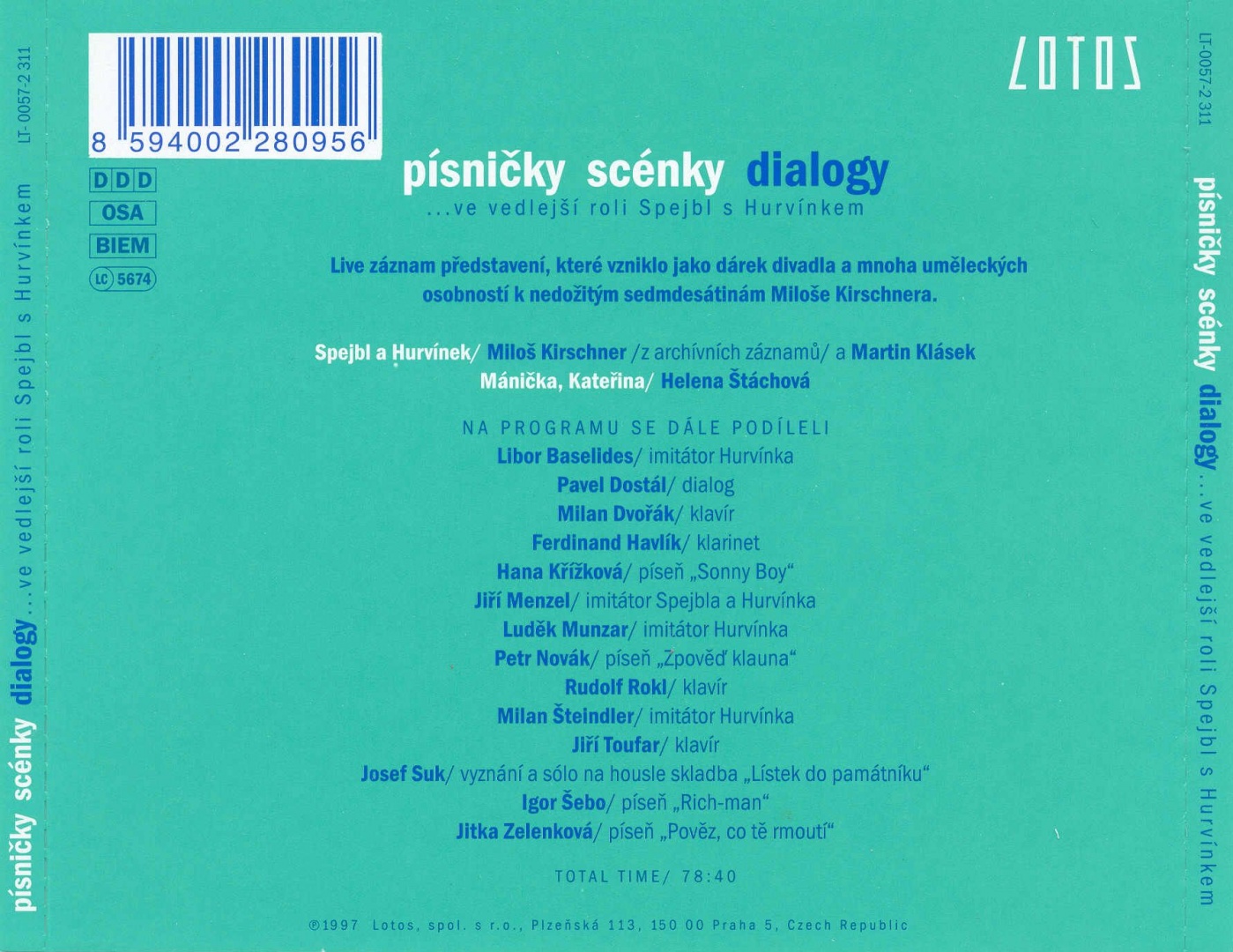 S dárkem pro něj i pro milovníky Kirschnerova humoru přispěchala i Milošova oblíbená firma Lotos, která tento nádherný večer zachytila na věčnou paměť na zvukový nosič.