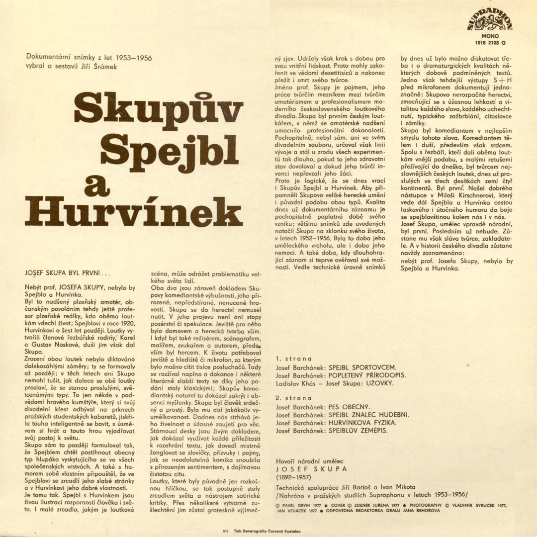 Loutky, které byly původně jen rozkošnou hříčkou, se tak postupně staly zrcadlem světa a nástrojem satirické kritiky. Přes několikeré výtvarné zušlechtění jim zůstal groteskně výjimečný zjev. Udržely však krok s dobou pro svou vnitřní lidskost. Proto mohly zakořenit ve vědomí desetitisíců a nakonec přežít i smrt svého tvůrce. Jméno prof. Skupy je pojmem, jeho práce tvůrčím mezníkem mezi tvůrčím amatérismem a profesionalismem moderního československého loutkového divadla. Skupa byl prvním českým loutkářem, v němž se amatérské nadšení umocnilo profesionální dokonalostí. Pochopitelně, nebyl sám, ani ve svém divadelním souboru, určoval však linii vývoje a stál u zrodu všech experimentů tak dlouho, pokud to jeho zdravotní stav dovoloval a dokud jeho tvůrčí invenci nepřevzali jeho žáci. Proto je logické, že se dnes vrací i Skupův Spejbl a Hurvínek. Aby připomněli Skupovo veliké herecké umění i původní podobu obou typů. Kvalita dnes už dokumentárního záznamu je pochopitelně poplatná době svého vzniku, většinu snímků zde uvedených natočil Skupa na sklonku svého života, v letech 1952-1956. Byla to doba jeho uměleckého vrcholu, ale i doba jeho nemoci. A také doba, kdy dlouhohrající záznam si teprve ověřoval své možnosti. Vedle technické úrovně snímků by dnes už bylo možno diskutovat třeba i o dramaturgických kvalitách některých dobově podmíněných textů. Jedno však tehdejší výstupy S + H před mikrofonem dokumentují jednoznačně: Skupovo nerozpačité herectví, zmocňující se s úžasnou lehkostí a vitalitou každého slova, každého uchechtnutí, typického zažbrblání, citoslovce i zámlky.