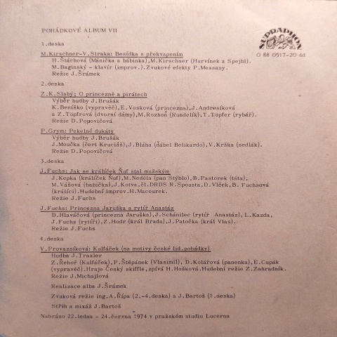 Zdeněk Kamil Slabý – O princezně a pirátech. Výběr hudby Jiří Grušák. Osoby a obsazení: Vypravěč (Karel Beníško), princezna (Eva Vosková), dvorní dámy (Jana Andresíková a Zdena Töpfrová), Rungelík (Miloš Rozhoň), rybář (Tomáš Töpfer).