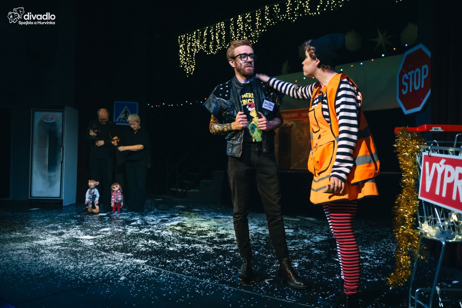 Kdo je zvyklý na tradiční loutkovou scénu, doprovázenou komorním příběhem a vtipnými dialogy mezi Spejblem a Hurvínkem, zapomeňte na to! Hurvínek s Máničkou zde figurují pouze jako průvodci příběhu a hledači psa Žeryka, čímž se dostávají do vedlejší pozice pozorovatelů, než do role hlavních postav, kolem kterých by se měl příběh postupně odvíjet. Pan Spejbl s Bábinkou jsou pak v příběhu zcela upozaděni, a ještě k tomu trochu zesměšněni. Pan Spejbl jako neschopný moderátor noční předpovědi počasí a paní Kateřina jako zapomnětlivá a vystresovaná hospodyně, která nestíhá připravit ani vánoční cukroví. Na druhou stranu se představení může pochlubit několika postavami, které v příběhu přímo září a strhují pozornost zcela na sebe. Ať už se jedná a postavu uvědomělé a citlivé popelářky Drahy Výpečkové, které se zhostila skvělá Kateřina Höferová nebo rockového skladníka Robina Bobina, v podání výtečného Pavla Nováka, který žije jen pro obchod a vánoční slevy. Obě tyto postavy v celém příběhu dominují a svými tanečními a pěveckými dovednostmi výrazně upozaďují tradiční vystoupení našich oblíbených loutkových hrdinů.