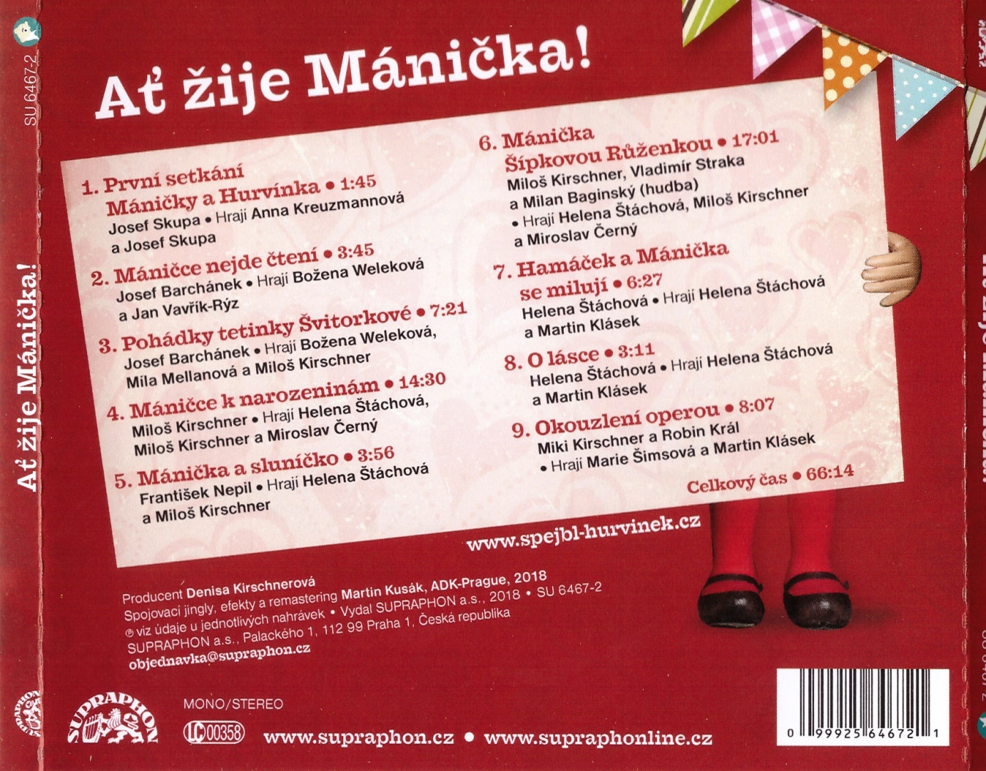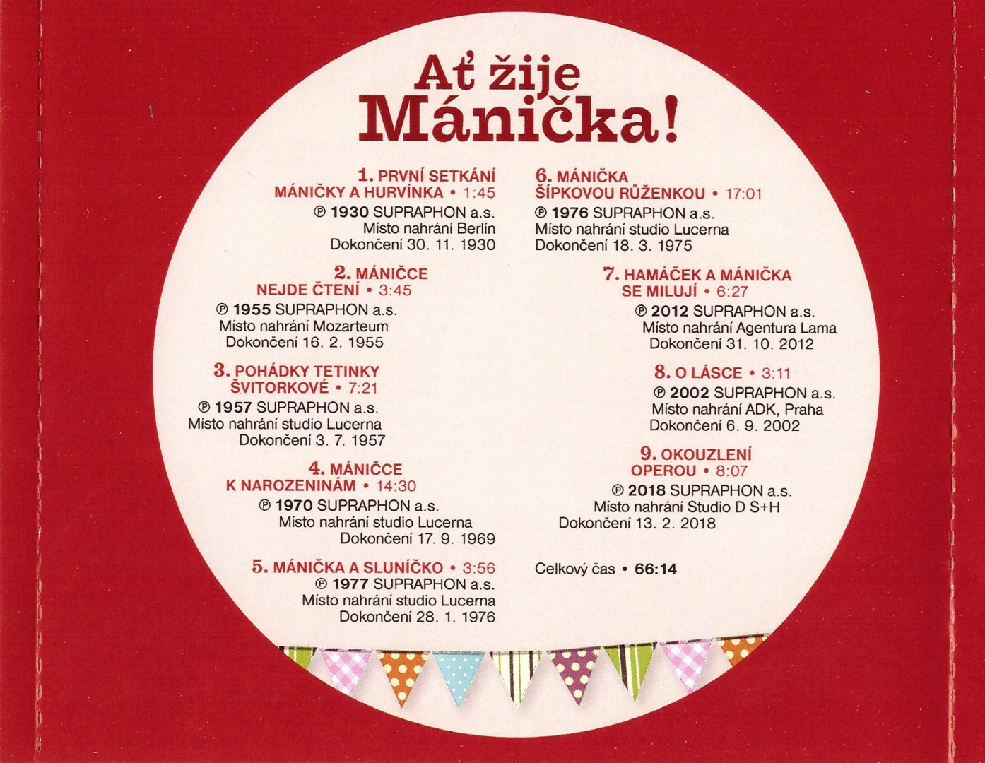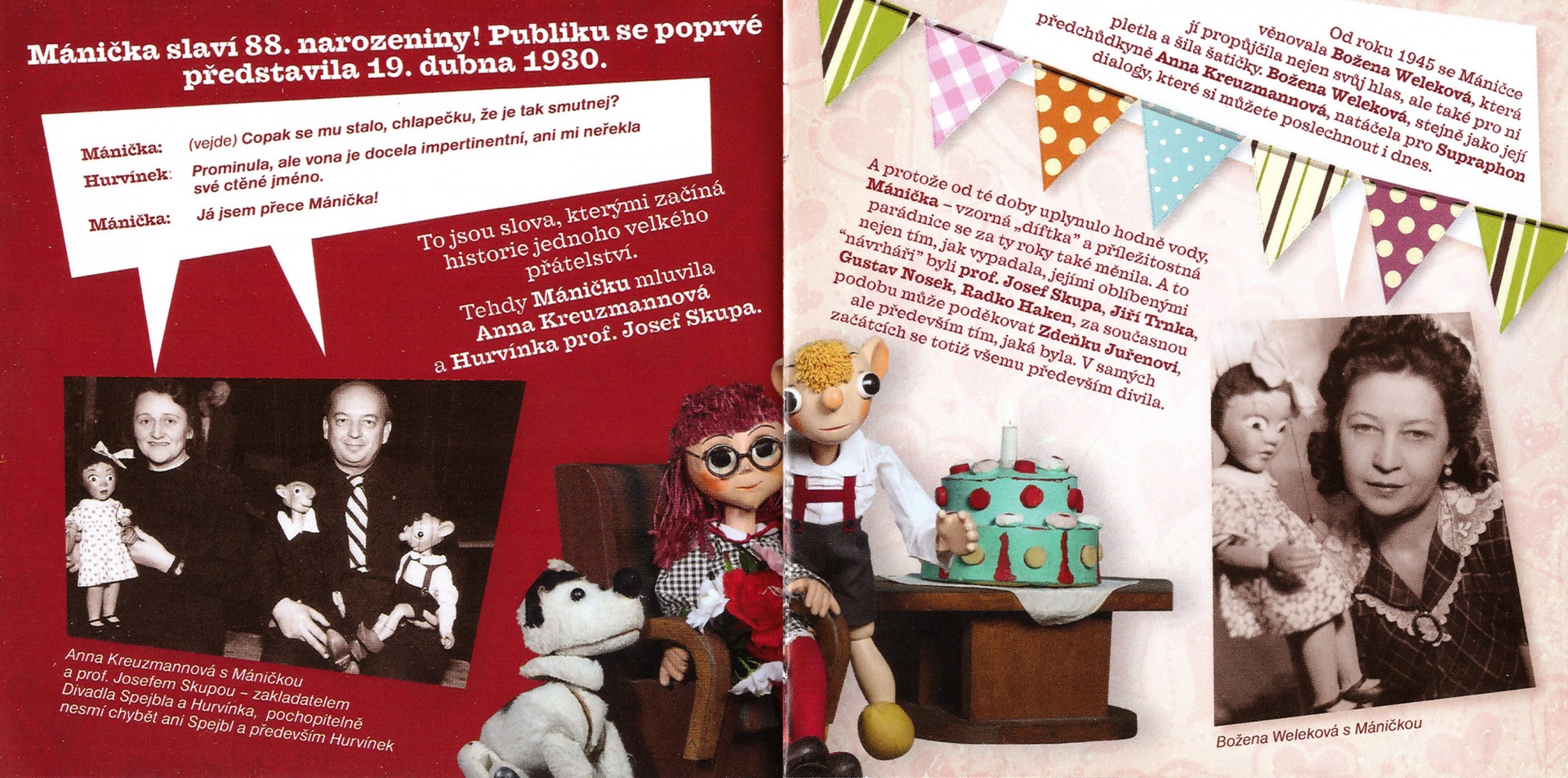 Když bylo Spejblovi a Hurvínkovi samotným smutno, objevila se obvykle vzorná, občas hubatá a vždycky dobrá kamarádka Mánička! Ač u žen a dívek se to galantně nemá prozrazovat, tady snad můžeme: právě slaví 88. narozeniny. Producentka Denisa Kirschnerová k tomu výročí vybrala ty nejzajímavější scénky v podání všech dosavadních historických interpretek. Zásadní podíl tu logicky má jedinečná Helena Štáchová, kterou si s Máničkou právem nejvíce spojujeme. Řada však logicky přijde i na Annu Kreuzmannovou a Boženu Welekovou mluvících tuto navždy nestárnoucí divadelní dívku v nahrávkách od třicátých do šedesátých let. Velkou příležitost tu poprvé dostane Marie Šimsová, nová představitelka postavičky, bez které by byl Hurvínkův svět nekompletní.