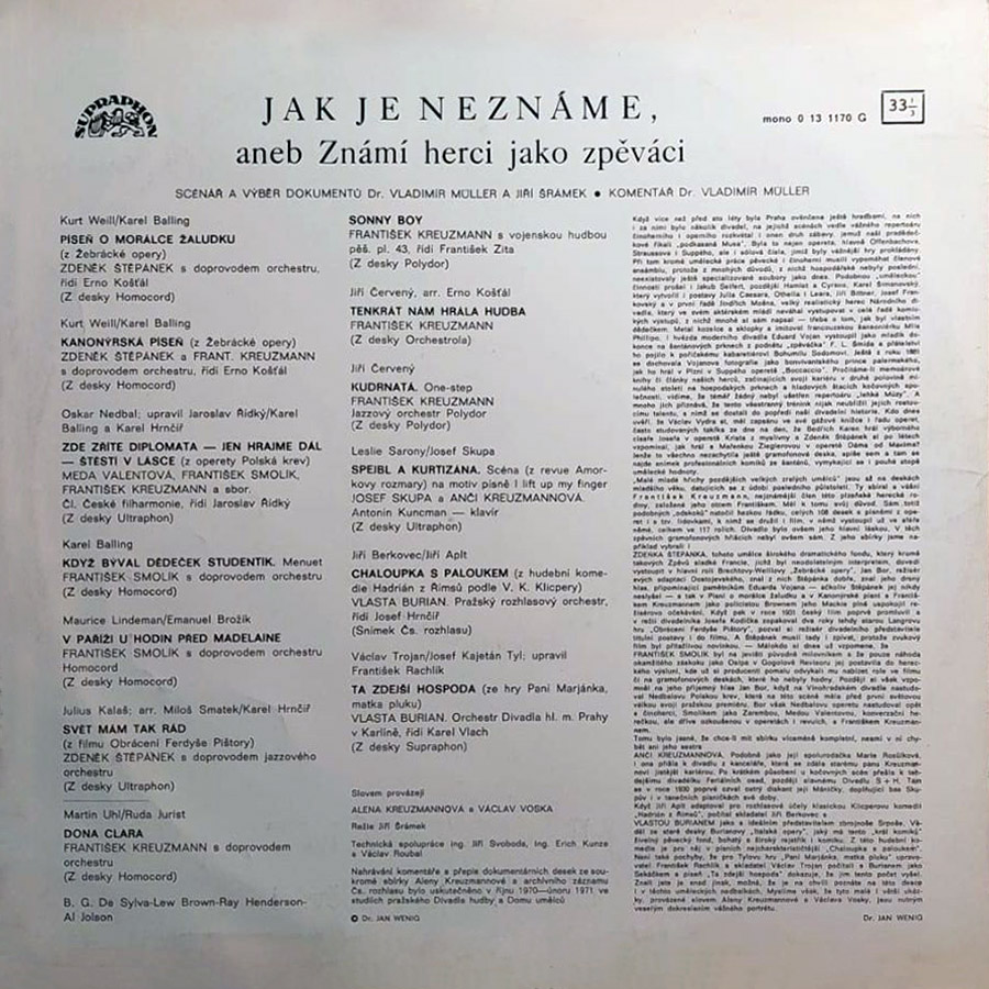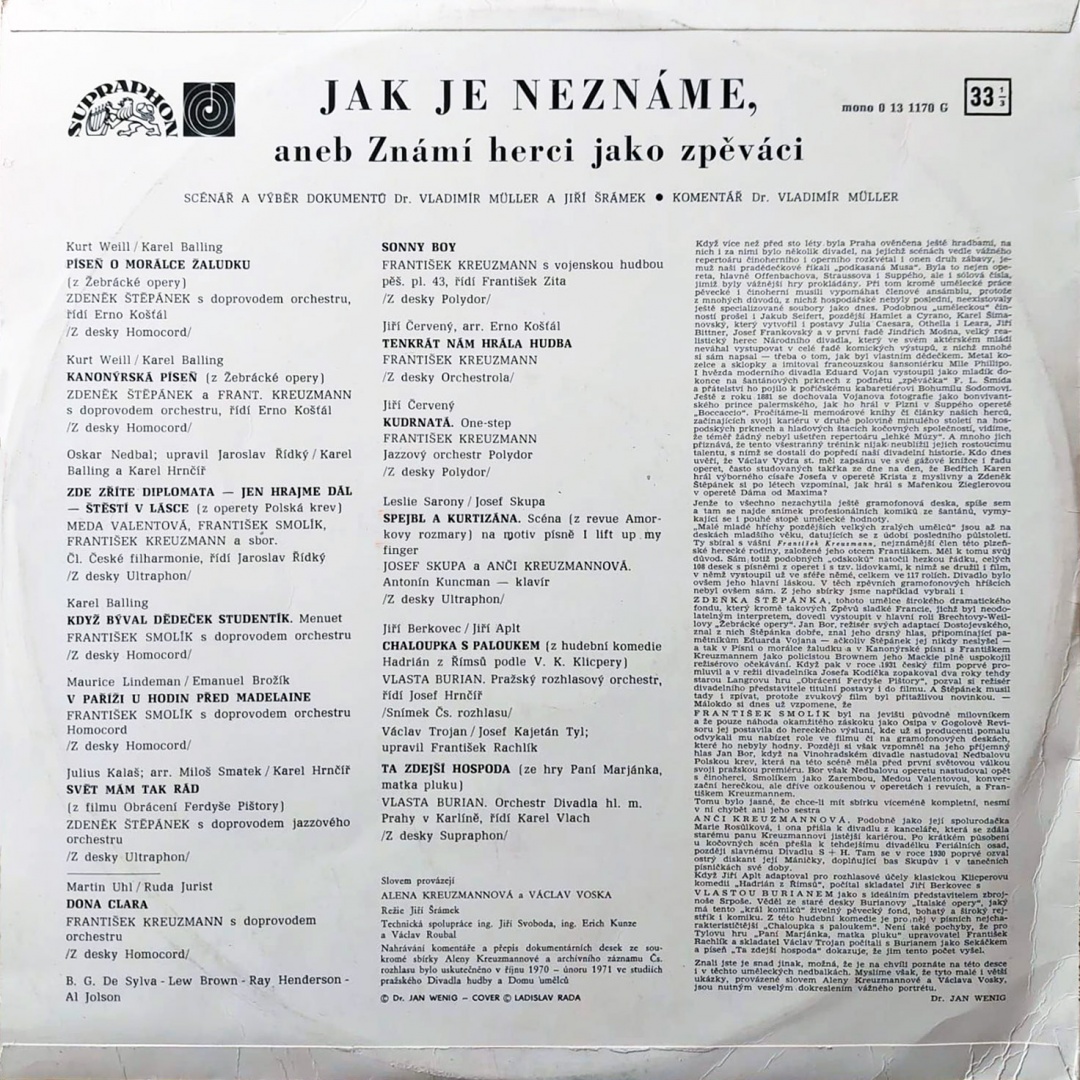Jak je neznáme aneb známí herci jako zpěváci - povídání a písně známých herců. Účinkují: Vlasta Burian, Libuše Freslová, Otomar Korbelář, František Kreuzmann, Josef Skupa, František Smolík, Zdeněk Štěpánek, Meda Valentová, Alena Kreuzmannová, Václav Voska.