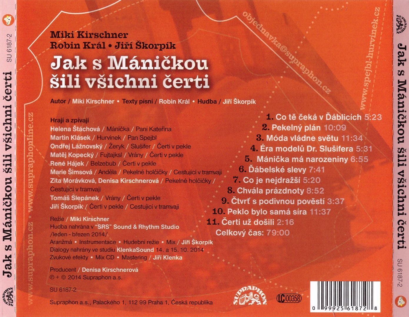 Vedle hlavních protagonistů se v obsáhlé roli čerta Doktora Slušifera představil Ondřej Lážnovský, Matěj Kopecký v roli Slušiferova pomocníka Fujtajksla a budoucí Mániččina interpretka Marie Šimsová ztvárnila Andělu. Písničky v sobě nezapřou hru se slovy a vtip, za všechny jmenujme spojení Ďábelské slevy, a jazykové hříčky se projevují i ve scénáři – Peklo se totiž nachází v Ďáblicích, skutečné pražské čtvrti. Prvotřídní zvukový design audia vznikl díky kvalitnímu studiu KlenkaSound.