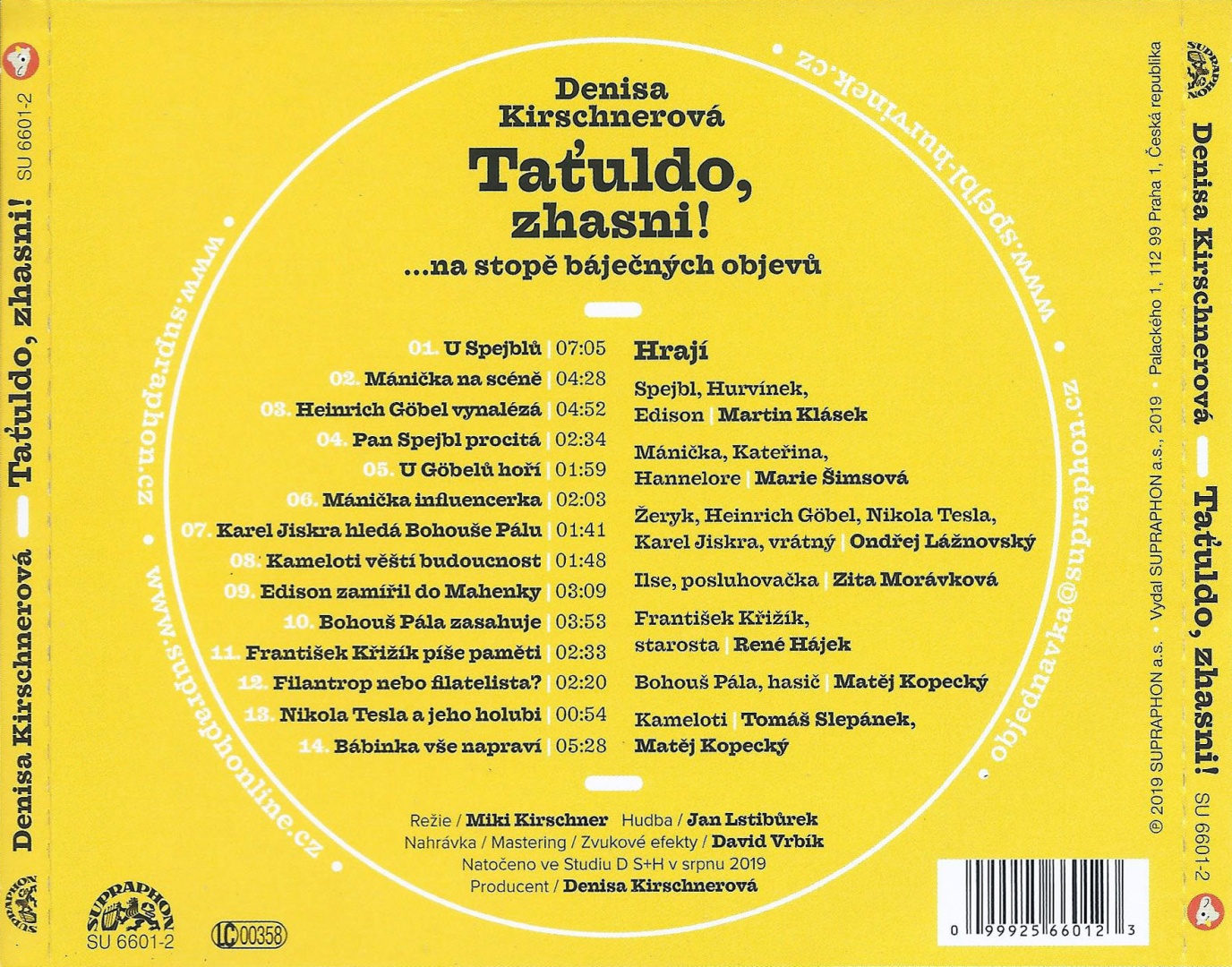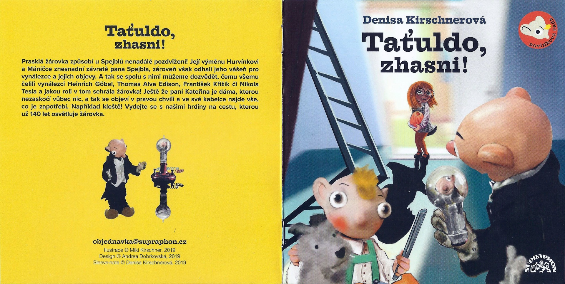 Zatímco v předchozích částech se do hlavních postav příběhů převtělila celá rodinka, v tomto titulu si na dané události nehraje a dané historické mezníky jsou zdramatizovány do krátkých epizod, v nichž hlavní postavy jednají samy za sebe. Do těchto úloh byli obsazeni členové Divadla Spejbla a Hurvínka. Série o vynálezech pro vytvoření atmosféry dané doby využívá jazyková specifika: ve Vysavači měli aktéři anglický přízvuk, ve Žvýkačce si mezi sebou onikali a V Taťuldo, zhasni! zní hned několik odlišností: pan Göbel se svou ženou mají německý přízvuk, Tesla ruský, Edison anglický a Křižík díky své české národnosti zůstal nezměněn. Protože v předchozích částech vystupovala i Bábinka, nechybí ani v Taťuldo, zhasni! Posluchači tak v této nahrávce mohou poprvé slyšet Marii Šimsovou v obsáhlém Mániččině partu a poprvé i její Bábinku.