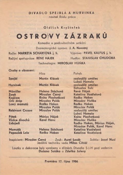 Spejbl-hlas: Martin Klásek; Spejbl-pohyb: Luboš Homola; Hurvínek-hlas: Martin Klásek; Hurvínek-pohyb: Bohuslav Šulc; Mánička-hlas: Helena Štáchová; Mánička-pohyb: René Hájek; Žeryk-štěk: Miroslav Černý; Žeryk-pohyb: Kateřina Vostřelová; Kopčem-hlas: Květa Plachetková; Kopčem-pohyb: Radko Haken; Orlí dráp-hlas: Miroslav Polák; Orlí dráp-pohyb: Miroslav Huňka; Lovci mamutů: Miroslav Polák; Radko Haken; Robinson Crusoe-hlas: Miroslav Polák; Robinson Crusoe-pohyb: Luboš Homola; Pátek-hlas: Marius Hájek; Pátek-pohyb: Květa Plachetková; Vůdce divochů-hlas: Miroslav Huňka; Vůdce divochů-pohyb: Karel Hanc; Mamutík-hlas: Helena Štáchová; Mamutík-pohyb: Kateřina Vostřelová; Papoušek Lolo-hlas: Radko Haken; Papoušek Lolo-pohyb: Kateřina Vostřelová