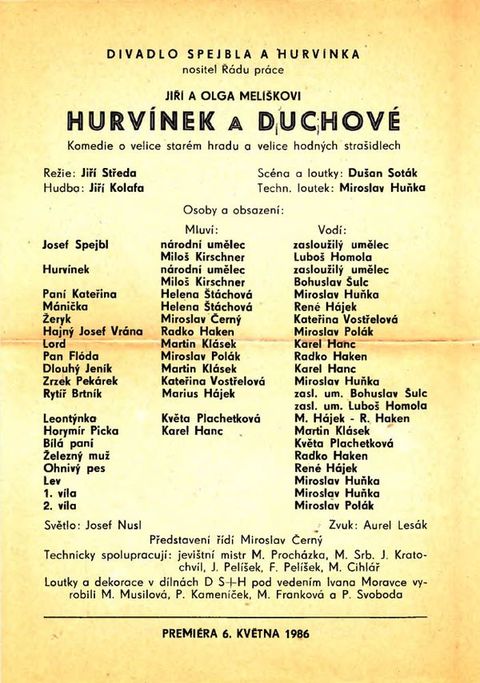 Spejbl-mluví: Miloš Kirschner; Spejbl-vodí: Luboš Homola; Hurvínek-mluví: Miloš Kirschner; Hurvínek-vodí: Bohuslav Šulc; Paní Kateřina-mluví: Helena Štáchová; Paní Kateřina-vodí: Miroslav Huňka; Mánička-mluví: Helena Štáchová; Mánička-vodí: René Hájek; Žeryk-štěká: Miroslav Černý; Žeryk-vodí: Kateřina Vostřelová; Hajný Josef Vrána-mluví: Radko Haken; Hajný Josef Vrána-vodí: Miroslav Polák; Lord-mluví: Martin Klásek; Lord-vodí: Karel Hanc; Pan Flóda-mluví: Miroslav Polák; Pan Flóda-vodí: Radko Haken; Dlouhý Jeník-mluví: Martin Klásek; Dlouhý Jeník-vodí: Karel Hanc; Zrzek Pekárek-mluví: Kateřina Vostřelová; Zrzek Pekárek-vodí: Miroslav Huňka; Rytíř Brtník-mluví: Marius Hájek; Rytíř Brtník-vodí: Bohuslav Šulc; Rytíř Brtník-vodí: Luboš Homola; Leontýnka-mluví: Květa Plachetková; Leontýnka-vodí: Marius Hájek; Leontýnka-vodí: Radko Haken; Horymír Picka-mluví: Karel Hanc; Horymír Picka-vodí: Martin Klásek; Bílá paní: Květa Plachetková; Železný muž: Radko Haken; Ohnivý pes: René Hájek; Lev ad.: Miroslav Huňka; Víla: Miroslav Polák