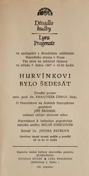 Výstava ku příležitosti 60. narozenin Hurvínka. Úvodní projev při zahájení výstavy pronesl prof. Dr. František Černý, DrSc.. O Hurvínkovi na deskách Supraphonu promluvil Jiří Šrámek, vedoucí režisér slovesné edice. Hurvínkovi k šedesátce gratuloval Miloš Kirschner. Scénář: Dr. Jindra Patková.