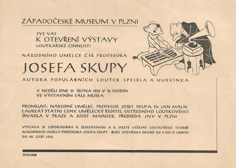 Uměleckou cestu významného českého loutkoherce Josefa Skupy ukazuje výstava, která probíhala od konce dubna 2017 v plzeňském Muzeu loutek až do konce roku 2017. Návštěvníci zde najdou nejen nejslavnější české loutky Spejbla a Hurvínka, ale i další loutky ze Skupova života, krátké filmové ukázky i záznamy Skupova hlasu. Výstava, která potrvá do konce letošního roku, připomíná dvě lednová výročí toho umělce - 125 let od Skupova narození a 60 let od jeho úmrtí. Expozice není pouhou sondou do Skupova života - v rámci výstavy se návštěvník seznamuje s loutkami, jež pod Skupovým vedením dokázaly v nesnadných dobách českého národa rozptýlit hutnou atmosféru. Unikátem je například několik loutek, které ještě nikdy nebyly vystaveny. Loni se podařilo najít zhruba 40 loutek starých kolem 80 let. Výstava ukazuje část těchto loutek, které už prošly rukama odborných restaurátorů. Je možné je porovnat s dosud nerestaurovanými loutkami. Výstava je rovněž doplněna o filmovou smyčku ze Skupova života. Ukazuje záběry z jeho domu, ukázky z her v zahraničí i výsek z filmu z roku 1952. Opomenut není ani jeden z největších darů, který Skupa od přírody obdržel, a tím byl jeho hlasový fond. Výstava je tak doplněna o audionahrávky a malý model divadla s několika krátkými texty Spejbla a Hurvínka, u něhož si zájemci mohou vyzkoušet Skupovu nelehkou práci s hlasem, tedy rychlé střídání basu a fistule. Zároveň tento malý model divadla slouží jako ideální průprava do finální části stálé expozice Muzea loutek, kde se již nachází velký divadelní sál, ve kterém je možné sehrát libovolné představení.